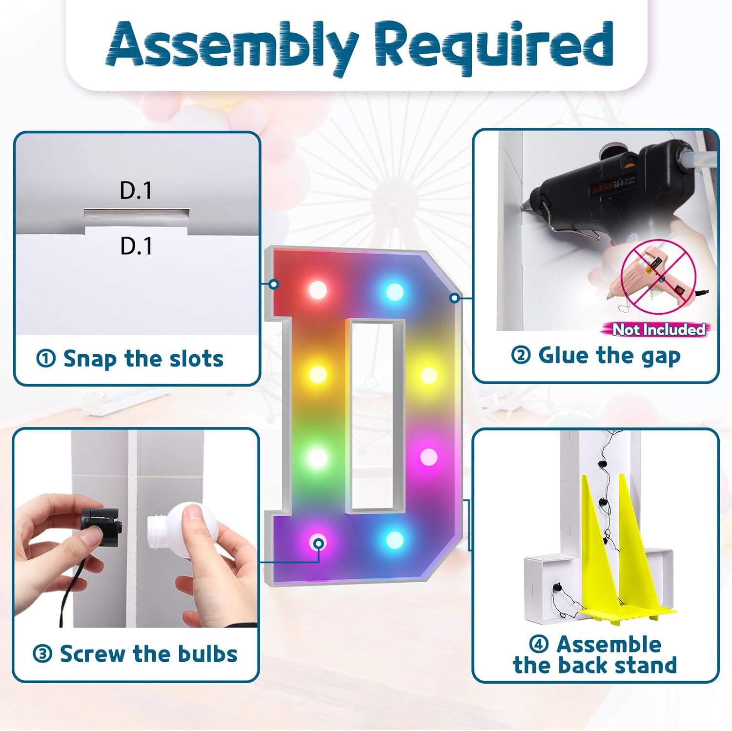 - Assembly Required. To assemble the light up numbers and letters, a hot glue gun is necessary. We have conveniently pre-cut the numbers into several pieces for your convenience. Simply consult the included instruction manual to easily assemble the impressive 4 ft tall and 3ft tall marquee numbers and letters using a hot glue gun.