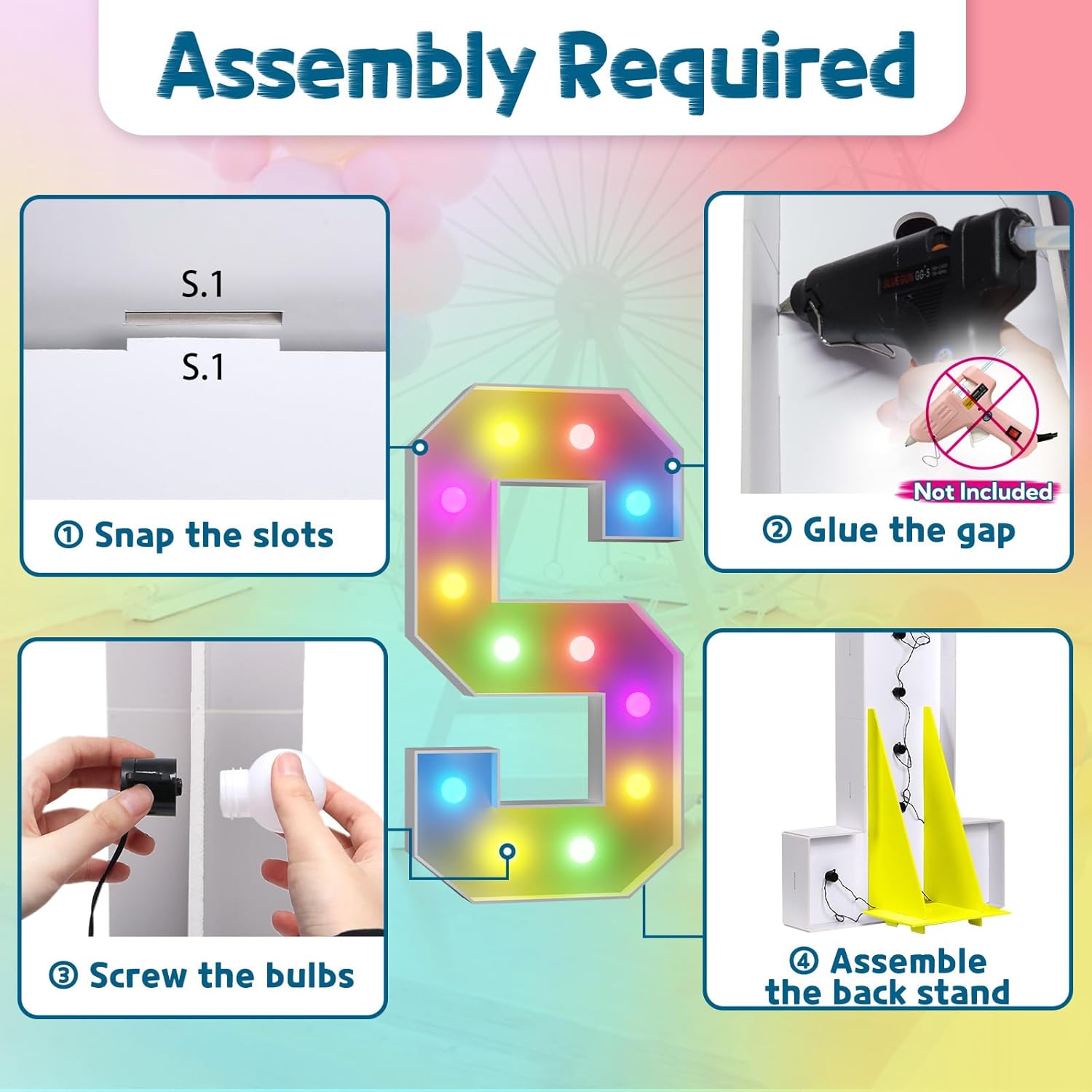 - Assembly Required. To assemble the light up numbers and letters, a hot glue gun is necessary. We have conveniently pre-cut the numbers into several pieces for your convenience. Simply consult the included instruction manual to easily assemble the impressive 4 ft tall and 3ft tall marquee numbers and letters using a hot glue gun.