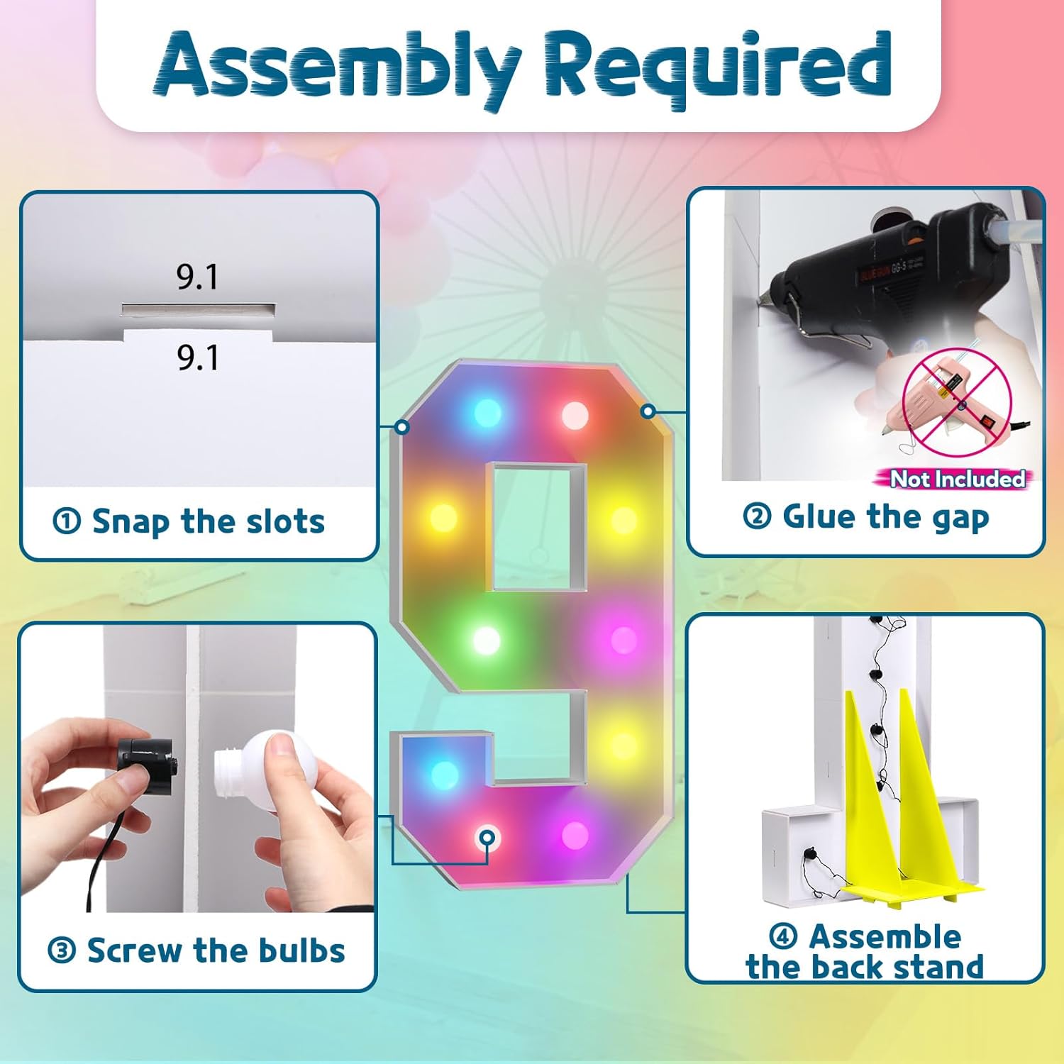 - Assembly Required. To assemble the light up numbers and letters, a hot glue gun is necessary. We have conveniently pre-cut the numbers into several pieces for your convenience. Simply consult the included instruction manual to easily assemble the impressive 4 ft tall and 3ft tall marquee numbers and letters using a hot glue gun.