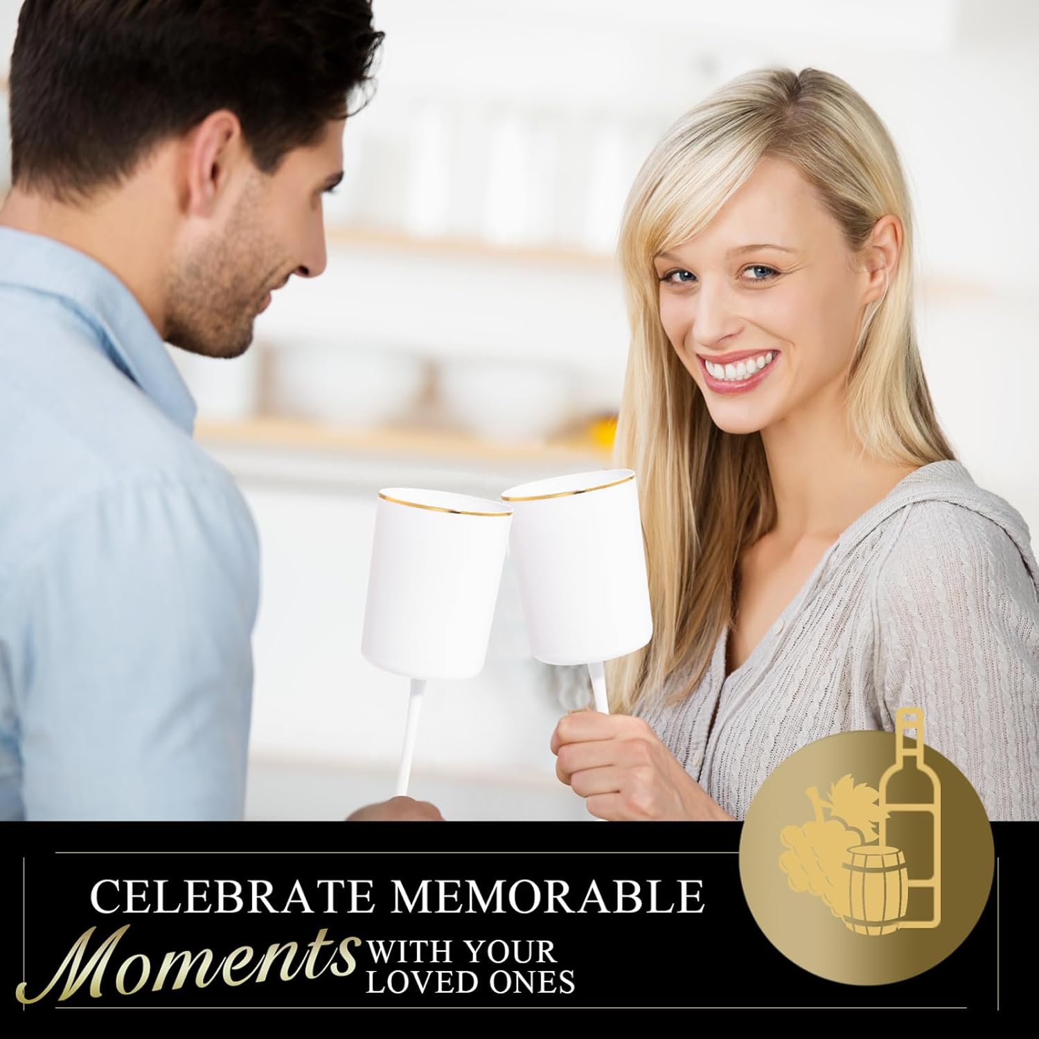 Ciaell 12 Pack White Plastic Wine Glasses with Stem - 10 Oz White and Gold Disposable Wine Glasses for Parties & Weddings & Poolside & Toasting & Outdoors & Graduation