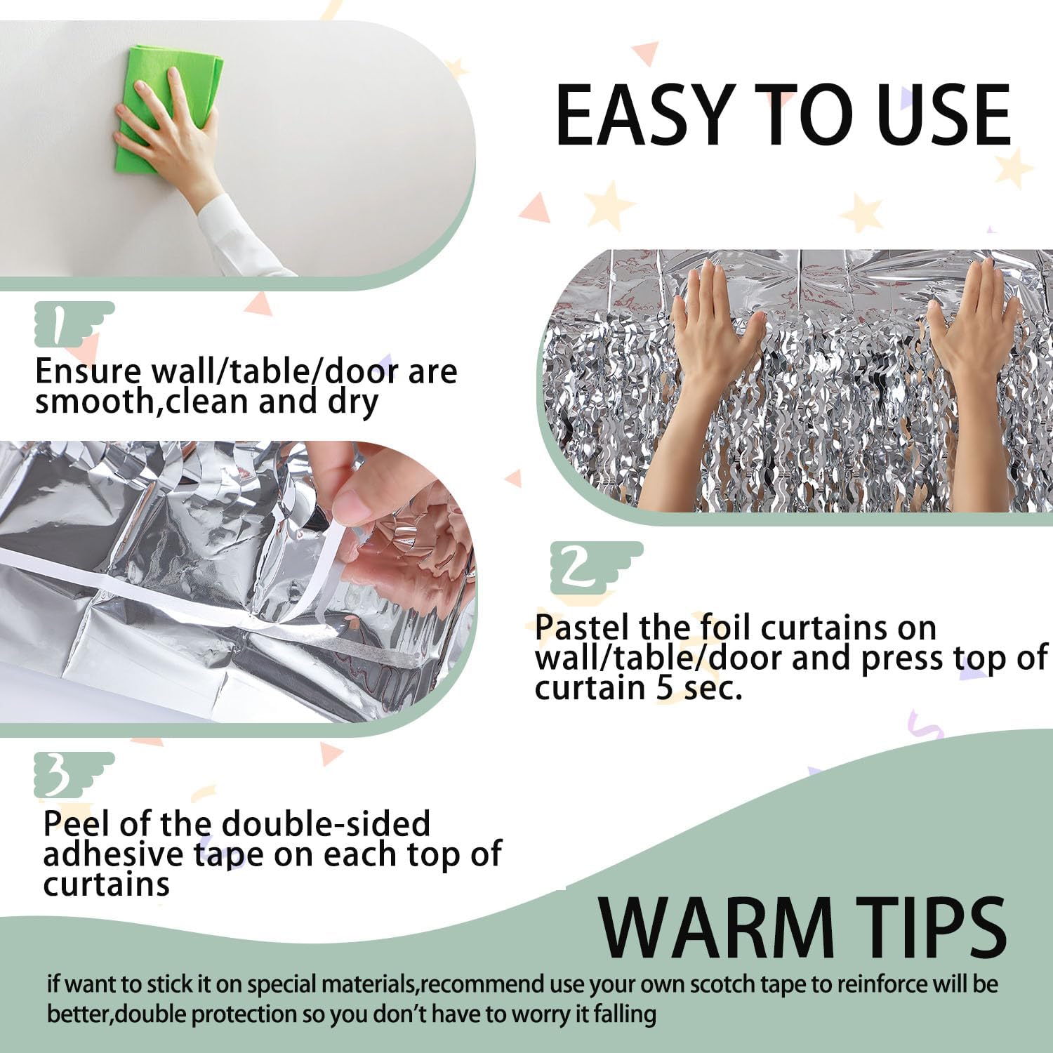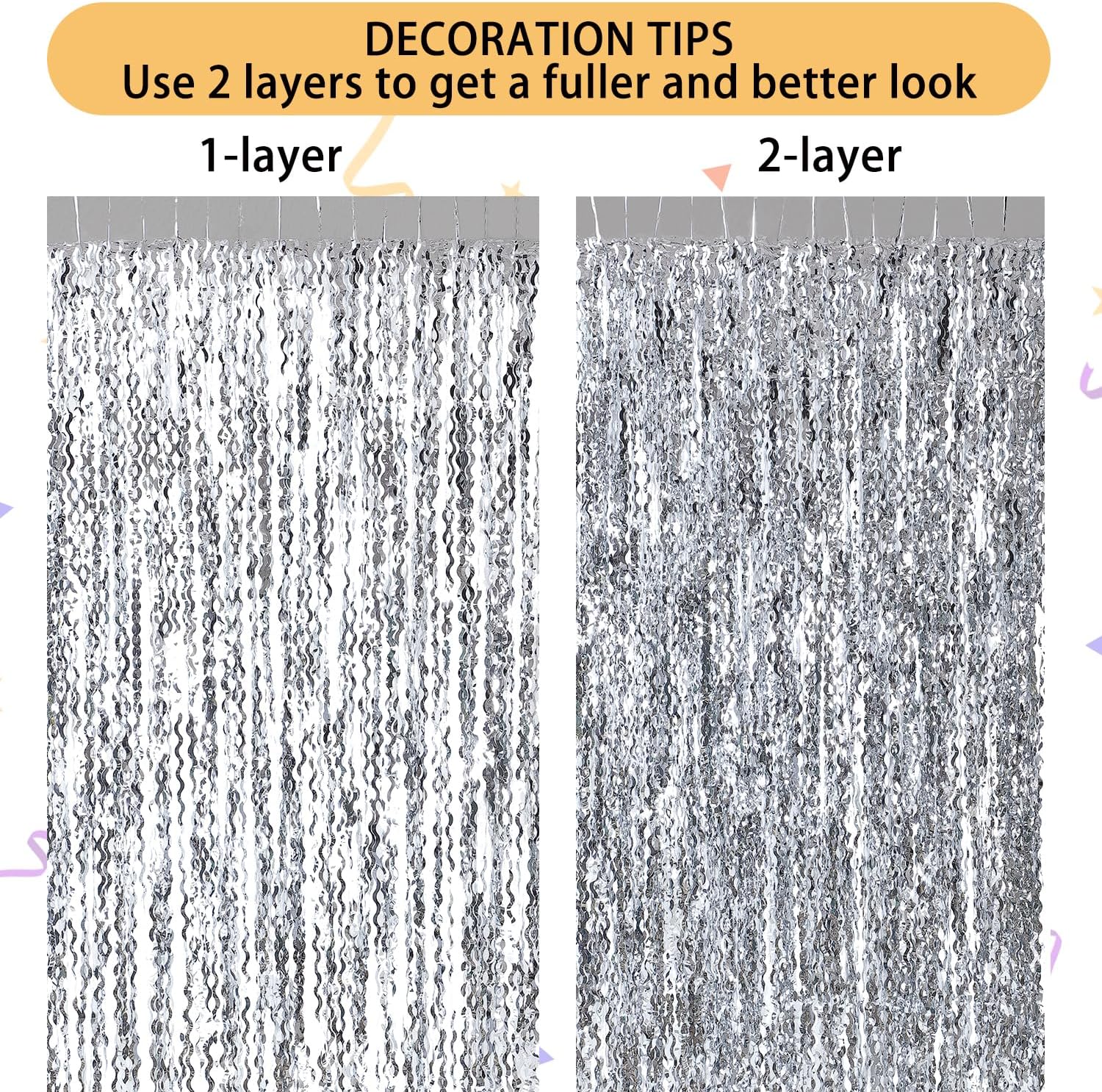 - Easy to Assemble: The back of the silver tinsel backdrop has double-sided tape, which can be stuck very firmly to any place you want such as walls, tables, door frames. You can use scissors to cut the length you want, and you can use two or more pieces of the curtain to splice and overlap to achieve unexpected effects!