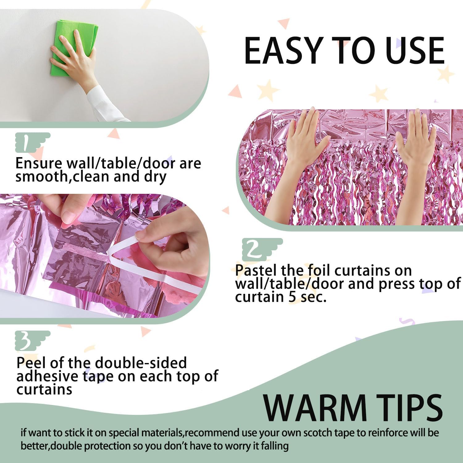 - Easy to Assemble: The back of the pink tinsel backdrop has double-sided tape, which can be stuck very firmly to any place you want such as walls, tables, door frames. You can use scissors to cut the length you want, and you can use two or more pieces of the curtain to splice and overlap to achieve unexpected effects!