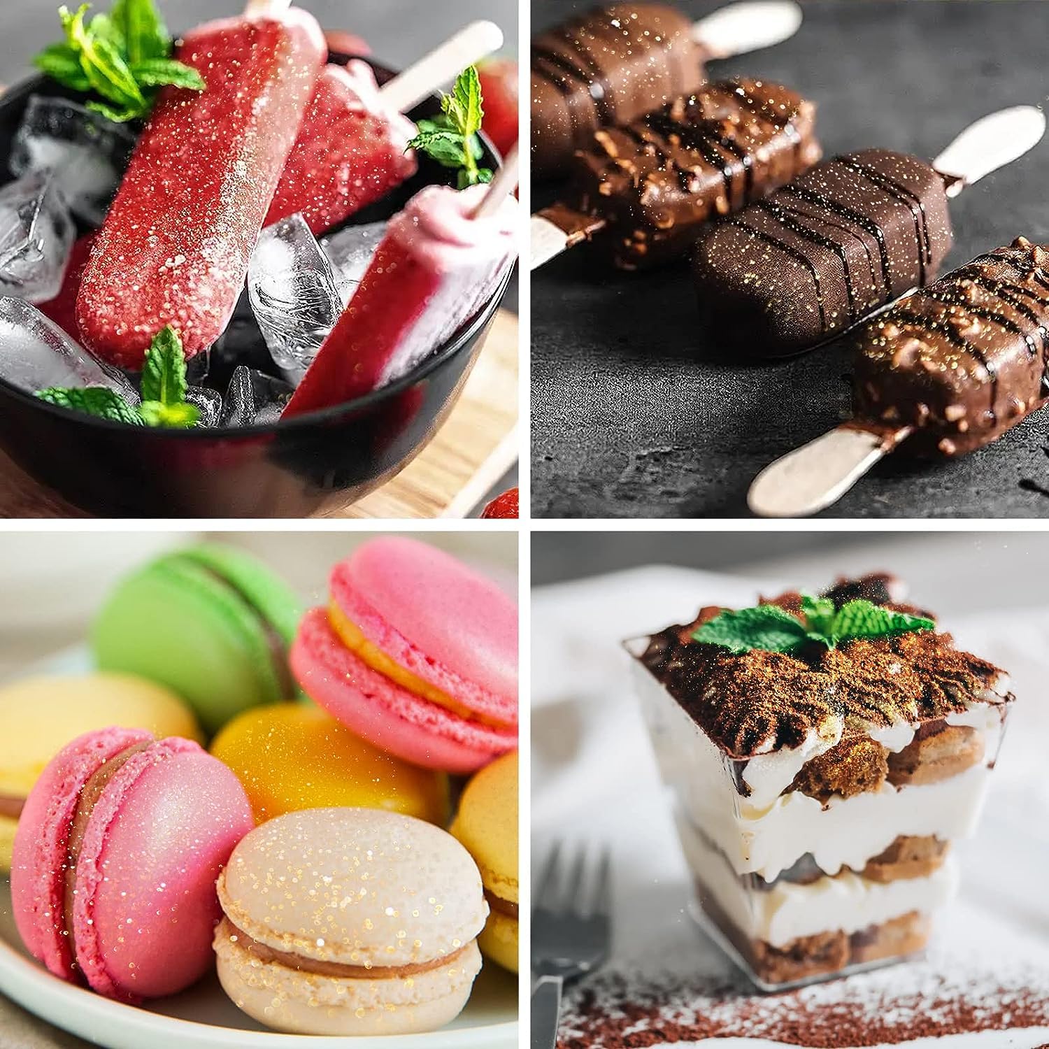 - 🍫【SAFE EDIBLE】This drink glitter edible dust is made with safe ingredients, 100% edible. The main ingredient is mica powder, which is a food grade edible ingredient, titanium dioxide and iron oxide are all state certified safe food grade additives. Luster dust edible has no smell or taste, so you don't have to worry about it affecting the flavour of your food or drink. Note: Please store glitter in a cool, dry place after use and do not expose the shimmering slitter to high temperatures.