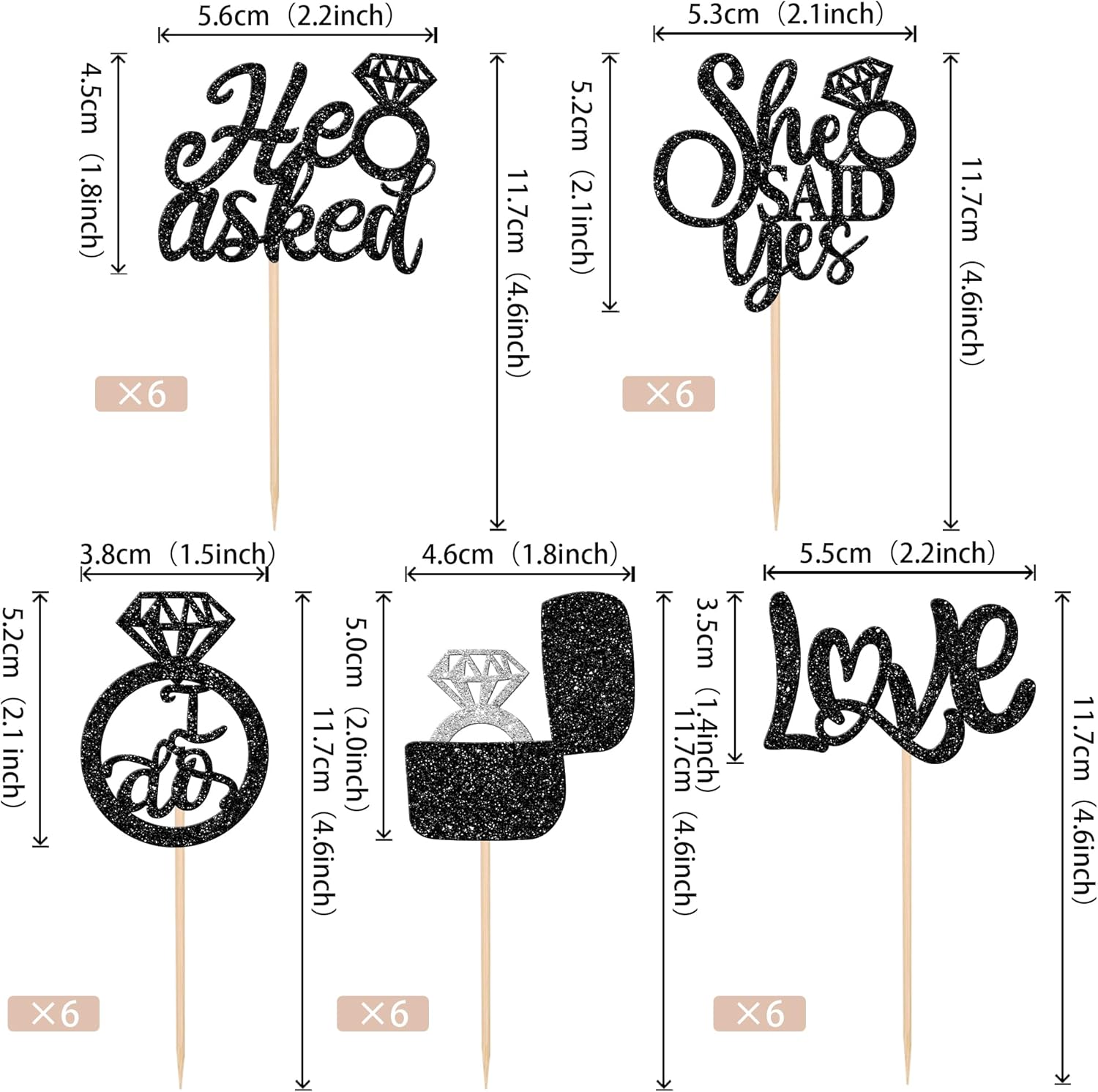 30 PCS He Asked She Said Yes Cupcake Toppers Love I Do Diamond Ring Cupcake Picks for Wedding Enaggement Bridal Shower Party Cake Decorations Supplies Black