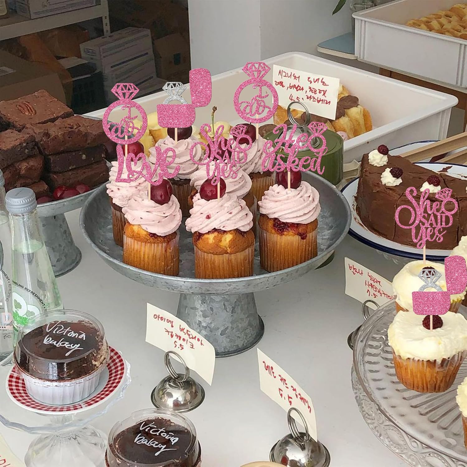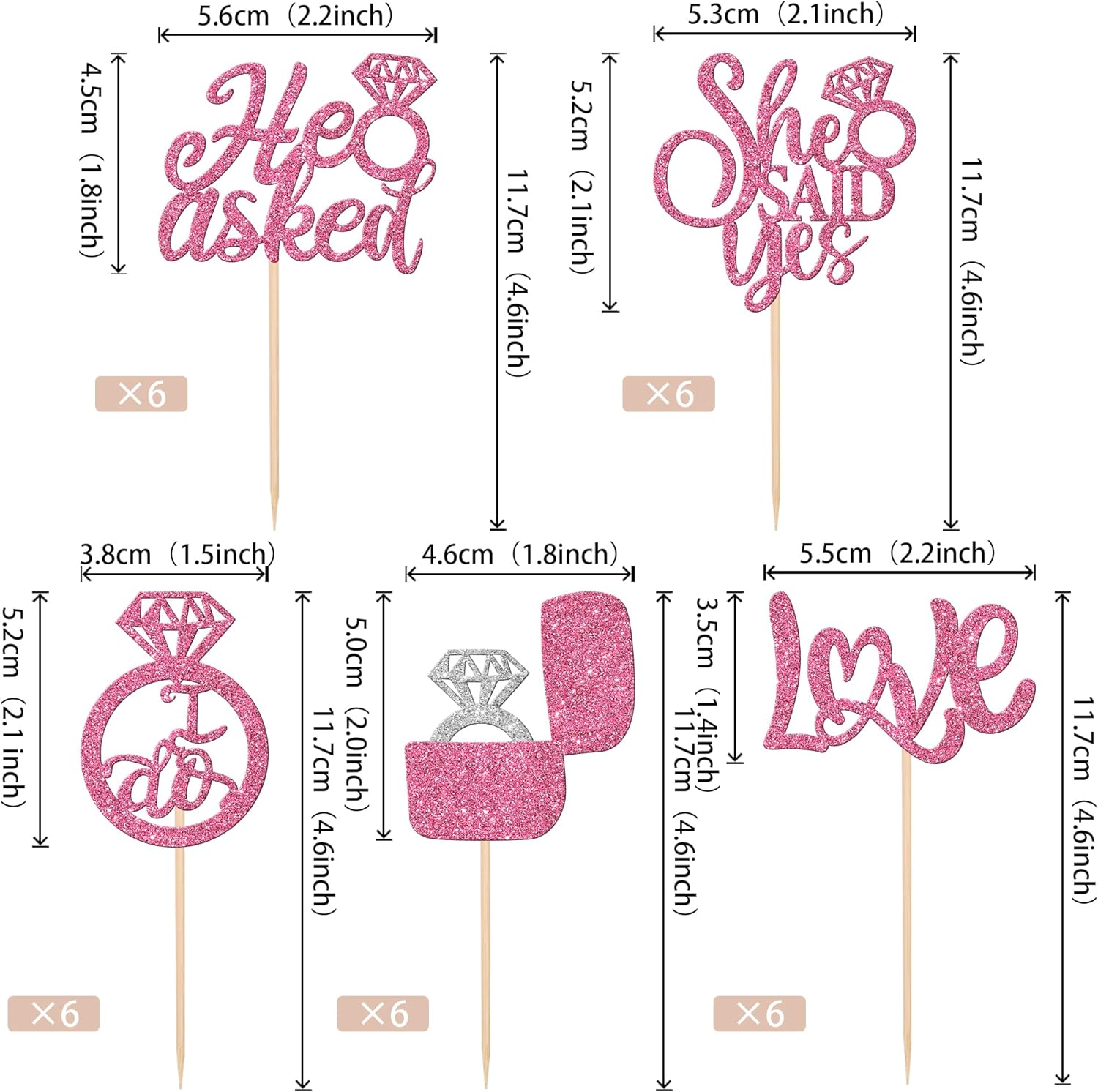 30 PCS He Asked She Said Yes Cupcake Toppers Diamond Ring Cupcake Picks Love I Do Cake Picks for Wedding Enaggement Bridal Shower Party Cake Decorations Supplies Pink