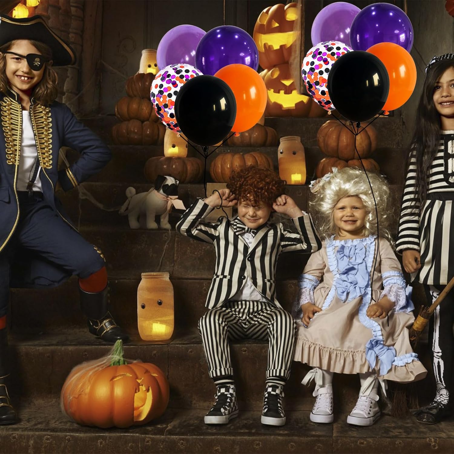 - 💀 Multiple Applications - Whether you're hosting a Halloween costume party, Halloween party decorations, Halloween birthday party supplies, trick or treat party supplies, spooky ghost theme parties, and haunted house decorations, or simply want to add a touch of Halloween spirit to your home, this black purple orange balloons set is a versatile choice. Hang it on walls, across doorways, or as a stunning table centerpiece.
