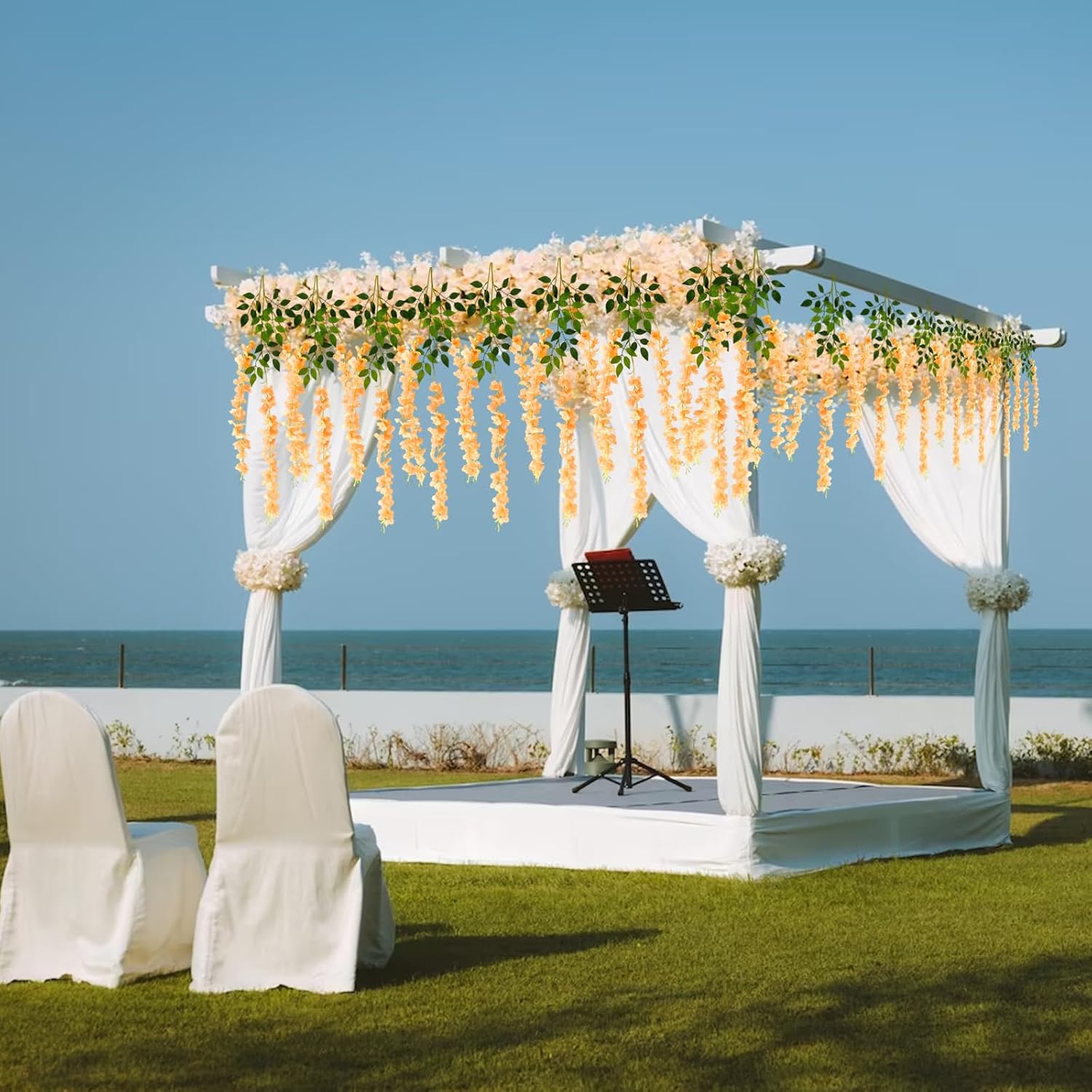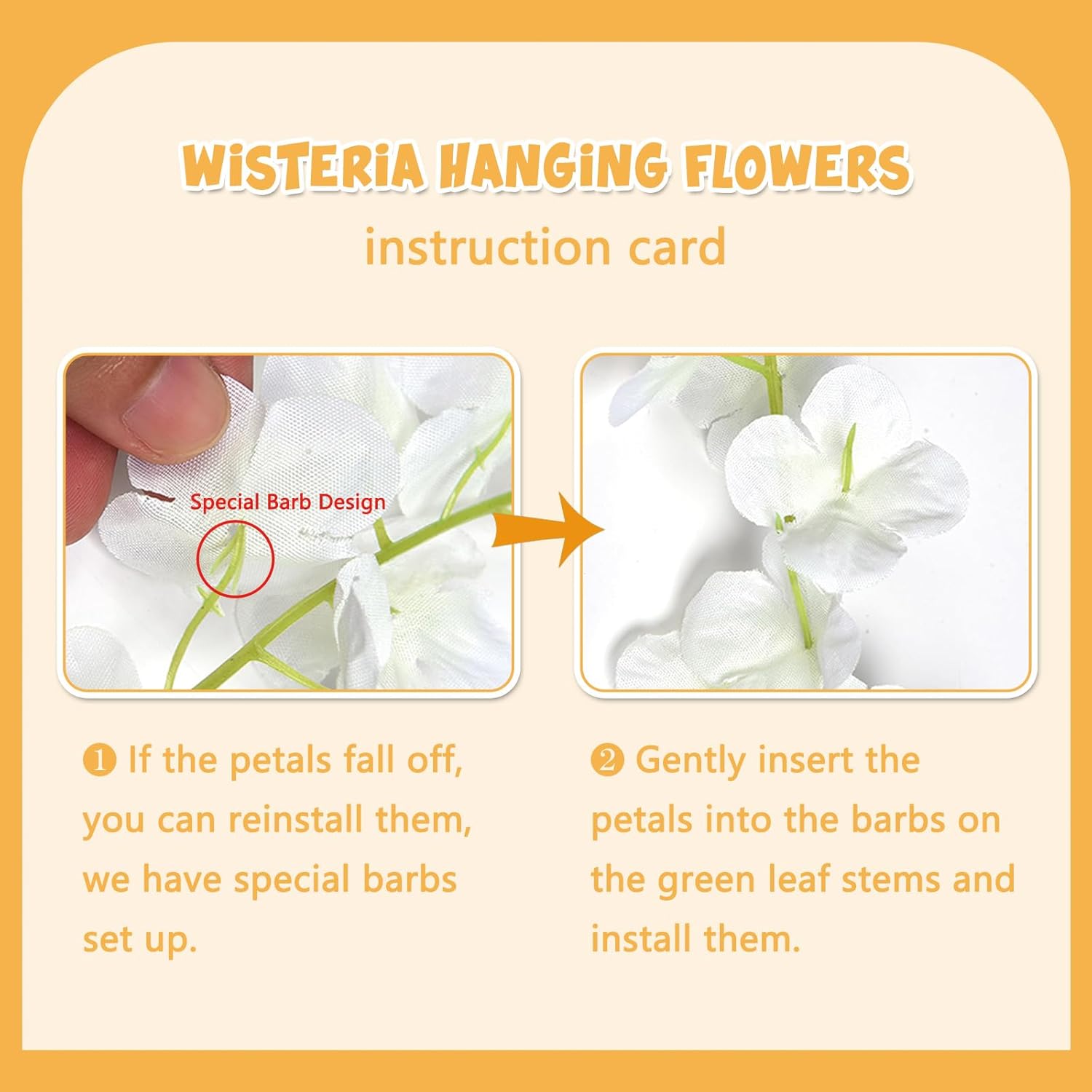 - 【Easy to Install】The orange hanging garland flowers stem are made of durable metal wire and covered with plastic. You can bend the wisteria flower in any shape to satisfy your decoration imagination without damaging it. And the wisteria flower is very easy to install and remove, you can reduce a lot of troubles on installation.