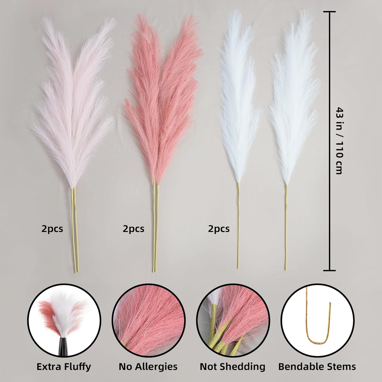 Pampas Grass Decor Tall, 43"/110cm Faux Pampas Grass 6 Stems Large Pompass Grass Branches Tall Bulk Boho Flower Arrangement for Home Room Wedding Party Decor