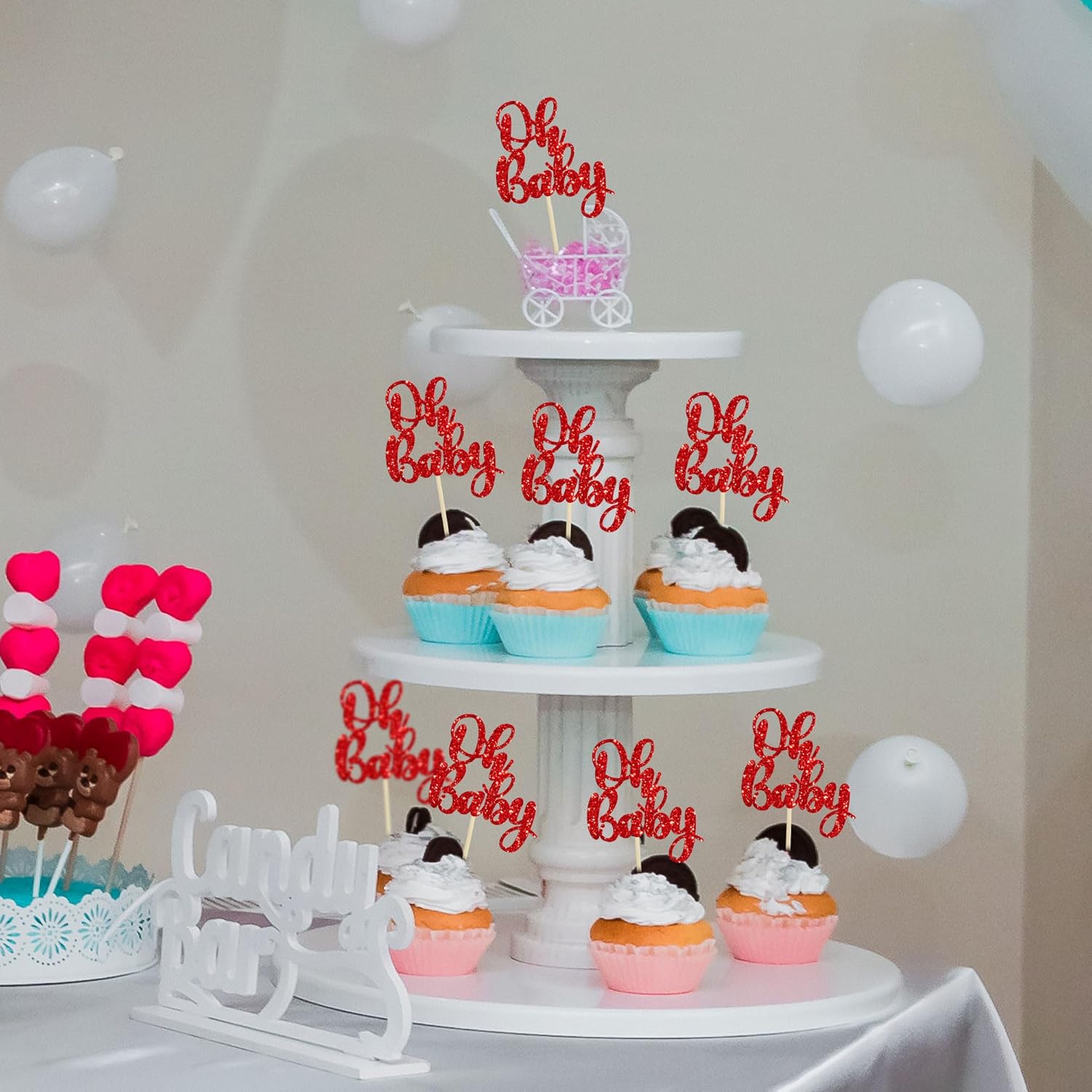 Gyufise 36Pcs Oh Baby Cupcake Toppers Glitter Baby Shower Cupcake Picks for Gender Reveal Baby Shower Kids Boys Girls Birthday Party Cake Decorations Supplies Red