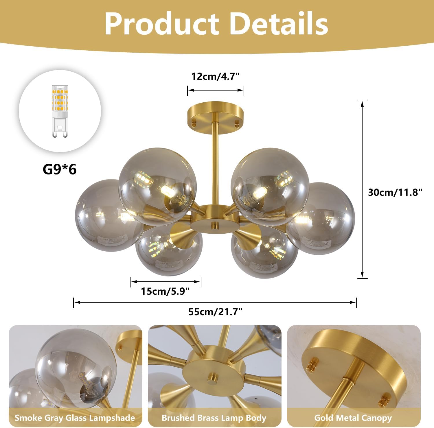 - Ideal Size & Bulb Included: The gold semi concealed ceiling lamp width: 21.7”(55cm), height: 11.8”(30cm), globe diameter: 5.9”(15cm), canopy: 4.7”(12cm). Light source: G9, voltage: 110-240V for worldwide. The gold and smoke gray ceiling light itself is not dimmable, but this bedroom lighting can be dimmable when use with dimmable bulb and dimmable switch