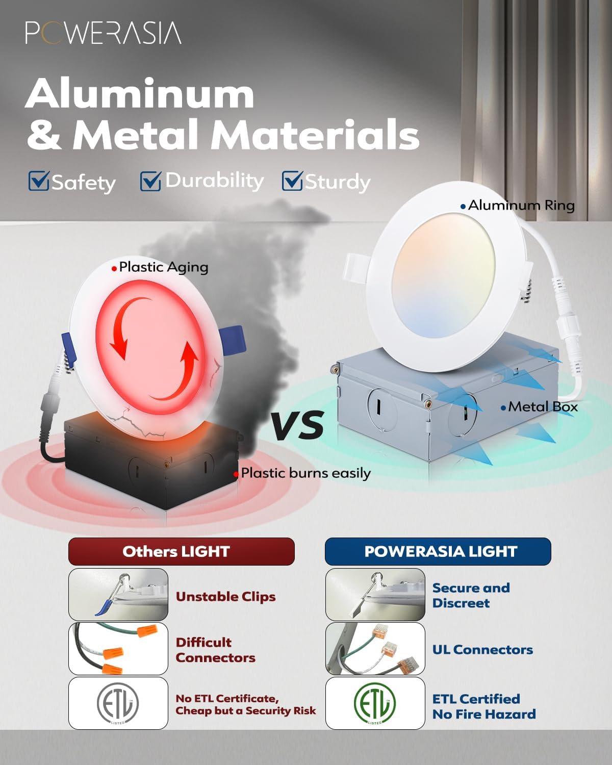 - 💡【High Brightness】 POWERASIA 90+CRI technology brings true color rendering to your house. The 4-inch slim lights use the new generation of LED chips with higher lumens and lower power. 850LM 9 Watts, which equals to 110W incandescent lamp, saving you up to 88% in energy costs.