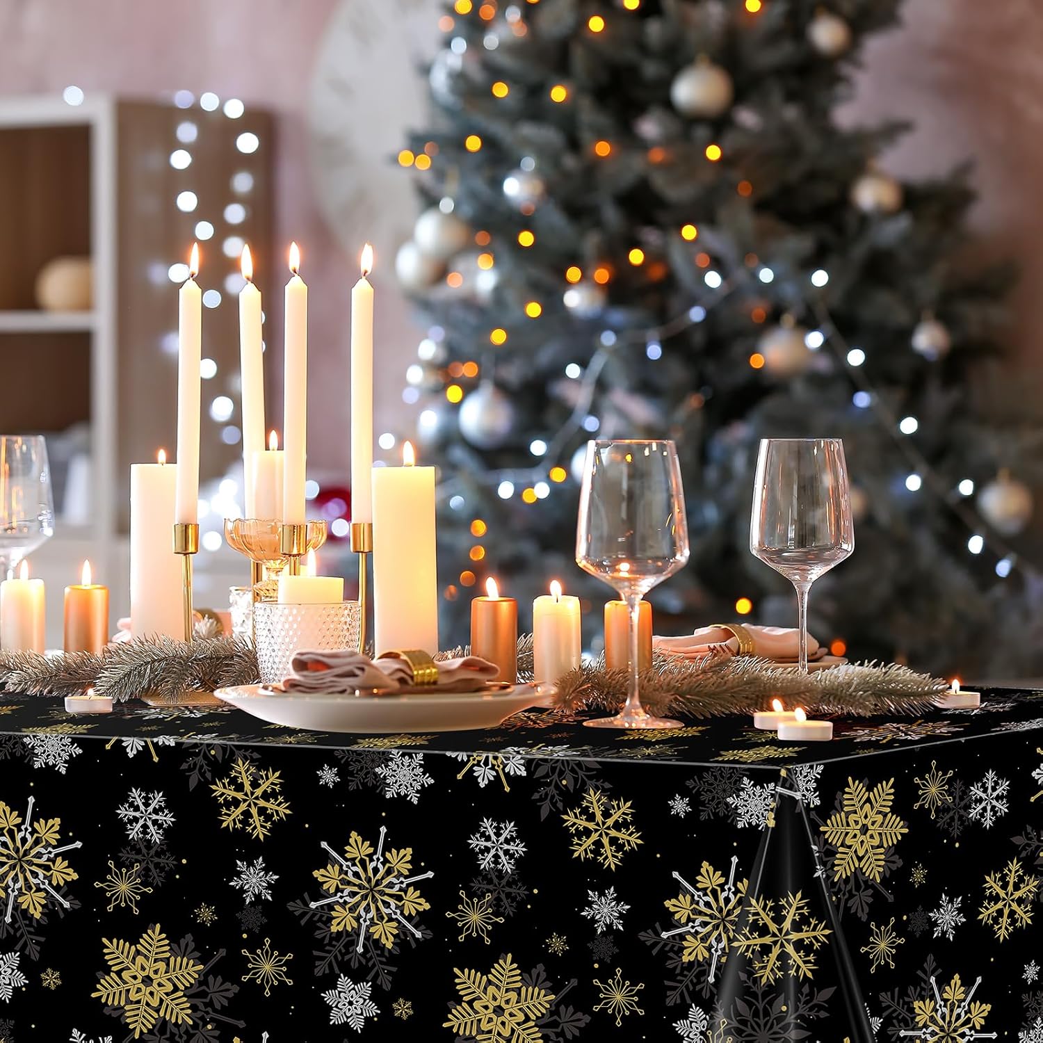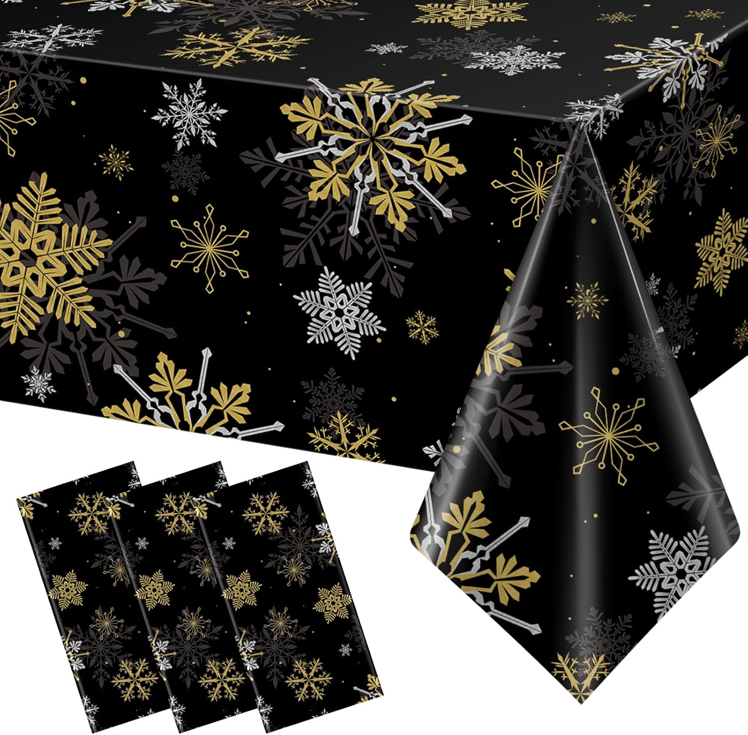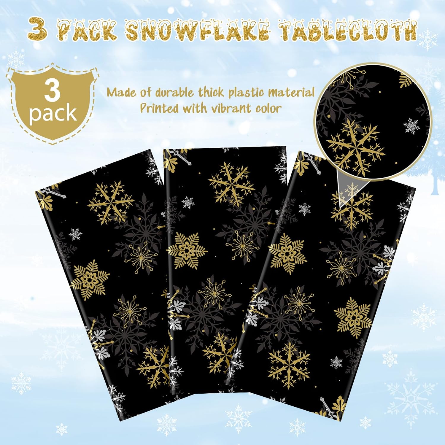 - What will you receive:3 pieces black and gold Christmas plastic party tablecloth,all over printed with gold and white snowflake patterns on black backdrop,ideal for decorating your winter holiday and Christmas party supplies and decorations