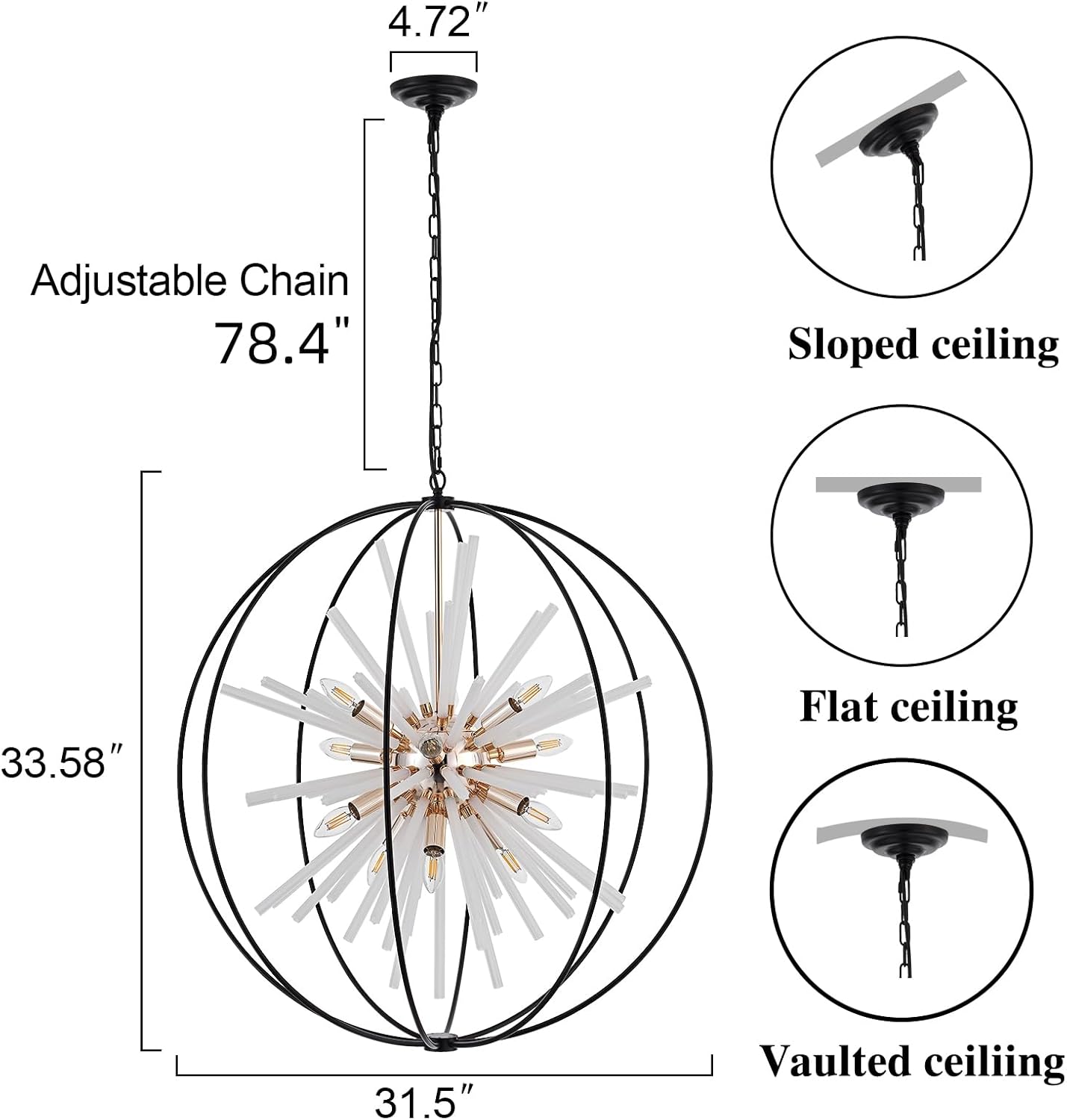 - 【Stylish Creative Design】The Black and Gold Sputnik Chandelier boasts a striking spherical body with Frosted Glass Tube design.It is not just a light for lighting, but also an art for decorating, looks like fireworks. Discover a world of exquisite illumination with our modern chandeliers, where contemporary meets vintage in perfect harmony.