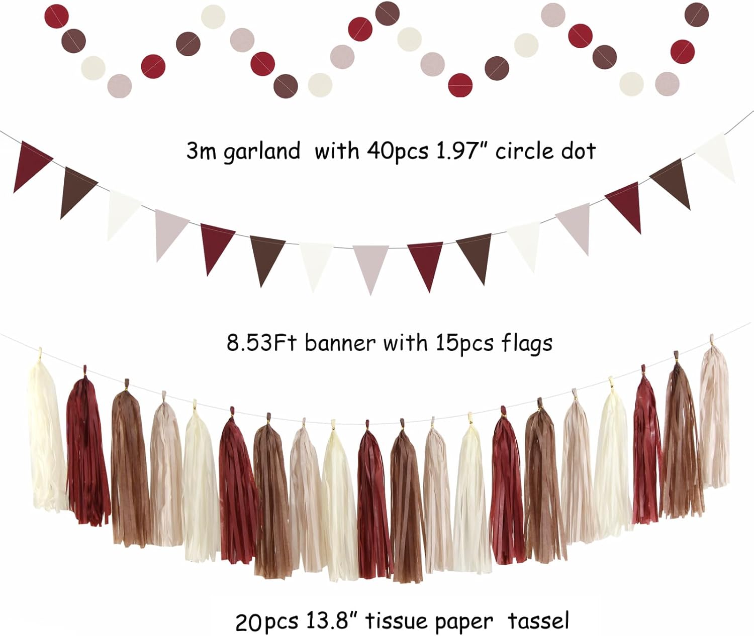 Brown Burgundy Champagne Dusty-Pink Party-Decorations - 33pcs Banner,Streamers Tassel Garland,Fall Boho Baby Shower,Wedding Tissue Pom Poms Honeycomb,Paper Lantern Fan,Birthday,Engagement Hugtmr