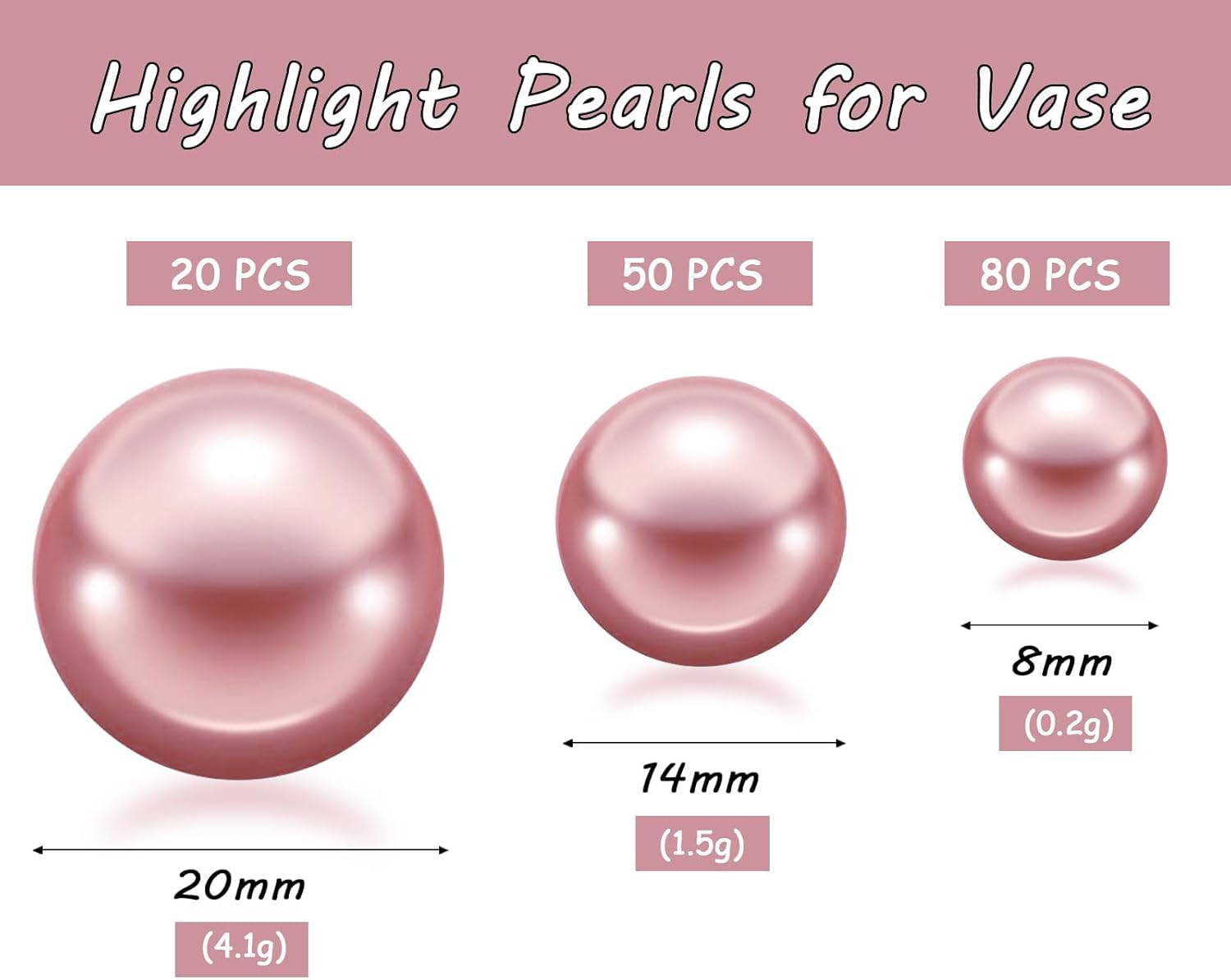 150Pcs Rose Gold Polished No Hole Faux Pearl Beads for Vase Filling Decorations, Plastic Pearls Vase Fillers, Table Scatters, Wedding Centerpiece, Home Decor, 8/14/20 mm