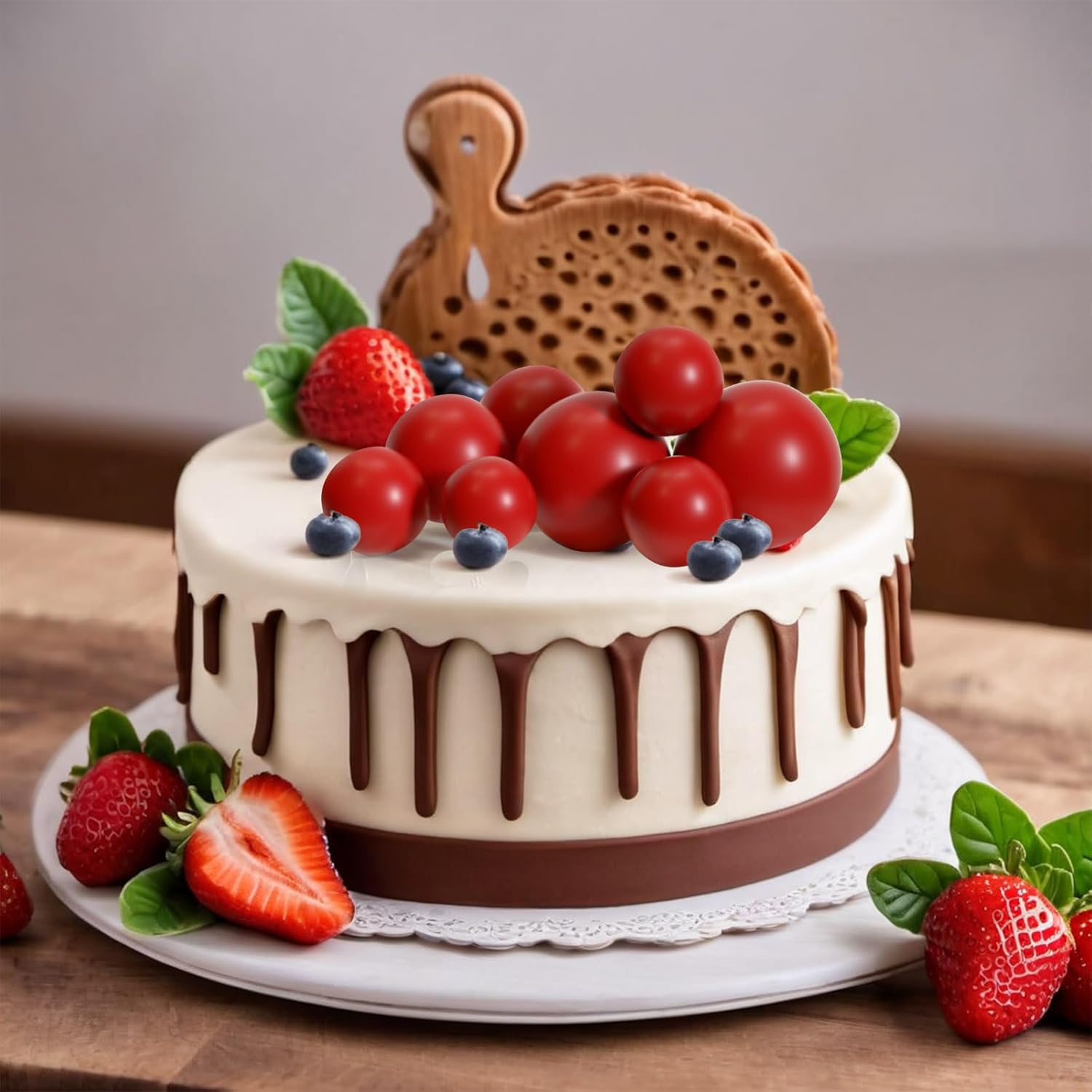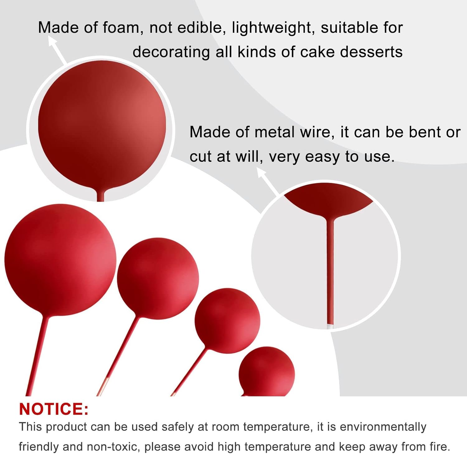 - Material: these ball decorations for cake are made of foam and wire. Safe to decorate food at room temperature, such as cake or dessert decorating use, or cupcakes, fruits, cheese and any dish and appetizer you want to decorate.