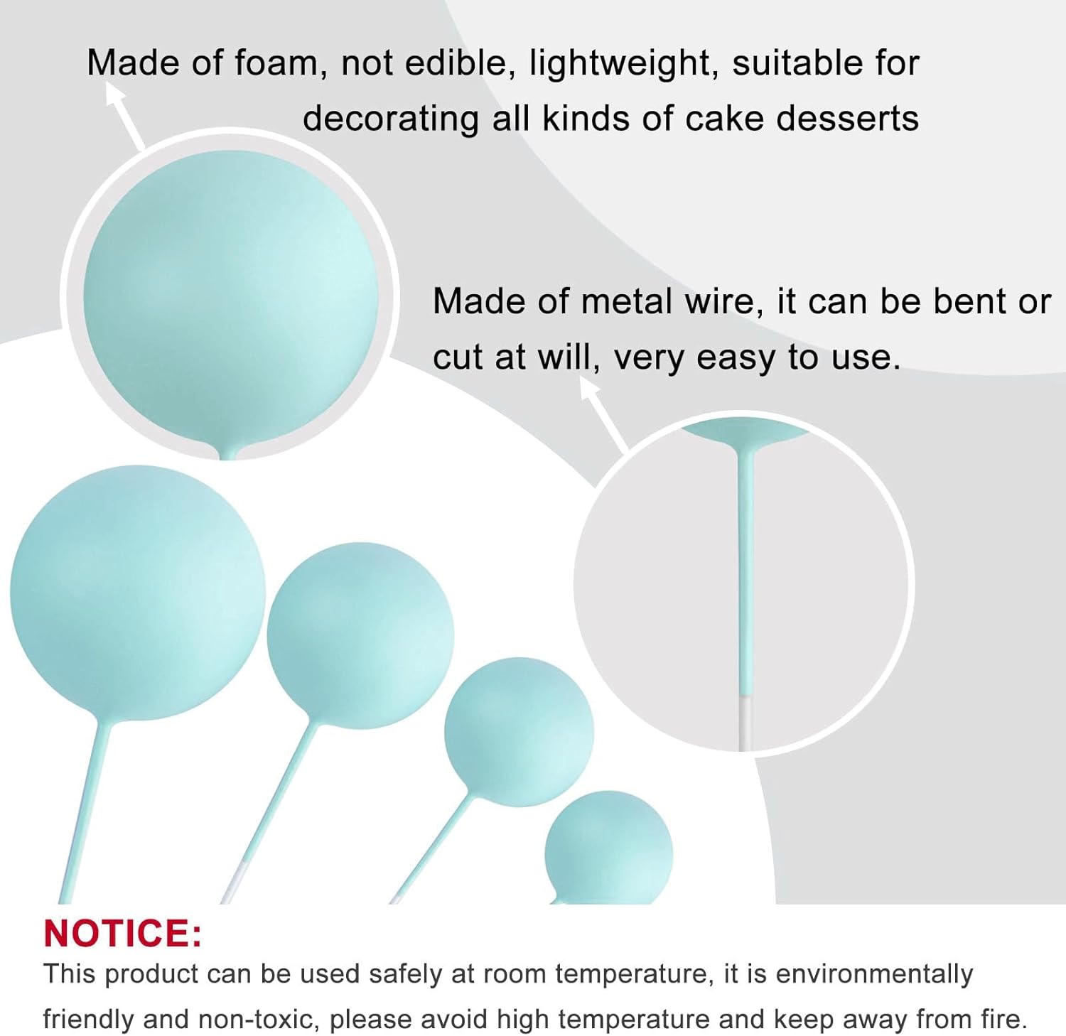 - Material: these ball decorations for cake are made of foam and wire. Safe to decorate food at room temperature, such as cake or dessert decorating use, or cupcakes, fruits, cheese and any dish and appetizer you want to decorate.