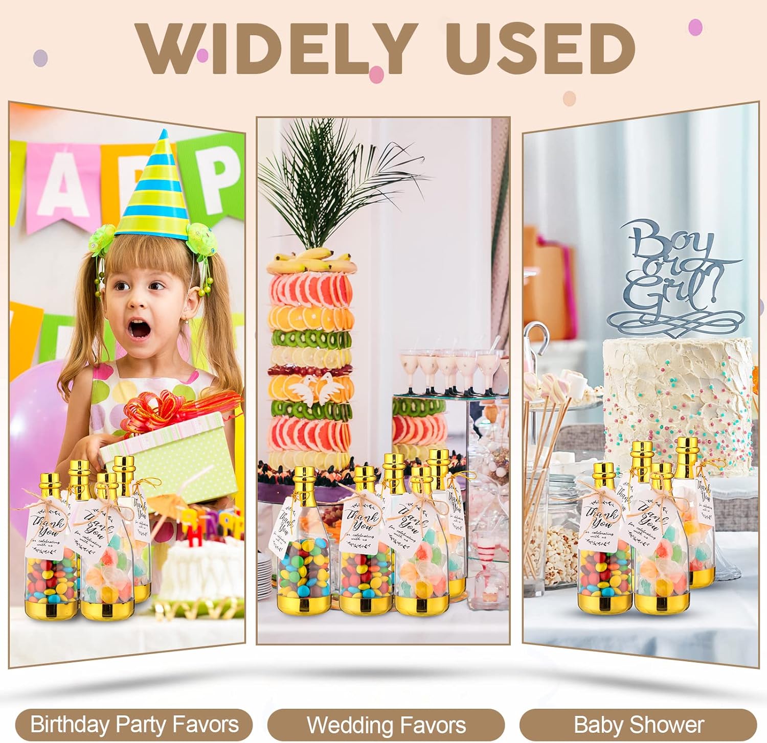 - Party Favors Combination: you will receive 100 pieces of mini champagne bottles for favors with 100 pieces of gift tags, 100 pieces of golden strings and 1 bundle of 65.6 feet/ 20 meters long rope, which are nice supplies for you to prepare party favors for weddings; These containers are designed into champagne bottle shape with a clear body, which can display the internal items clearly, so you can fill these bridal shower favors with colorful items for better visual effect