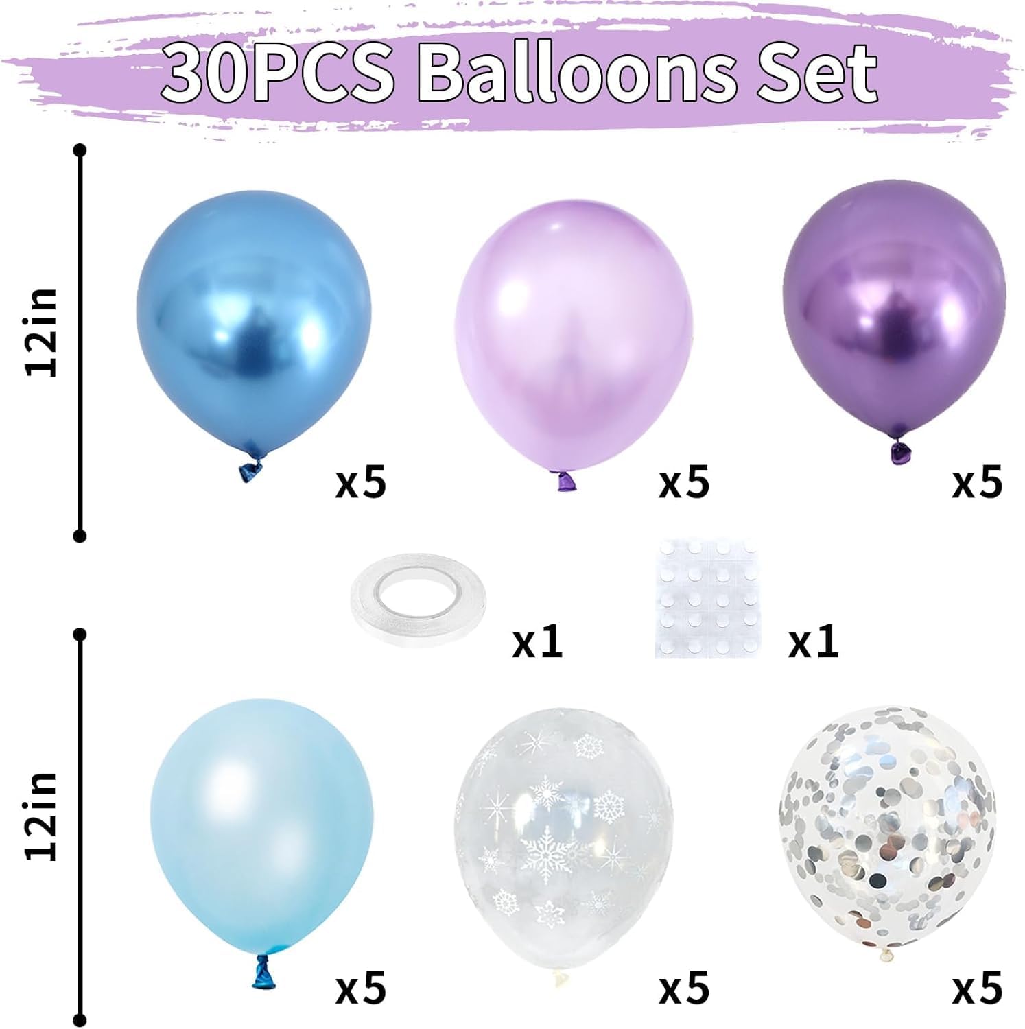 - Snow Balloon Sets: 5 x pearl blue balloons, 5 x pearl purple balloons, 5 x clear snowflake balloons, 5 x metallic blue balloons, 5 x metallic purple balloons, 5 x silver confetti balloons. That's a magnificent total of 30 pieces to unleash your creativity! Elevate your celebrations with our exquisite blue purple silver balloon sets!