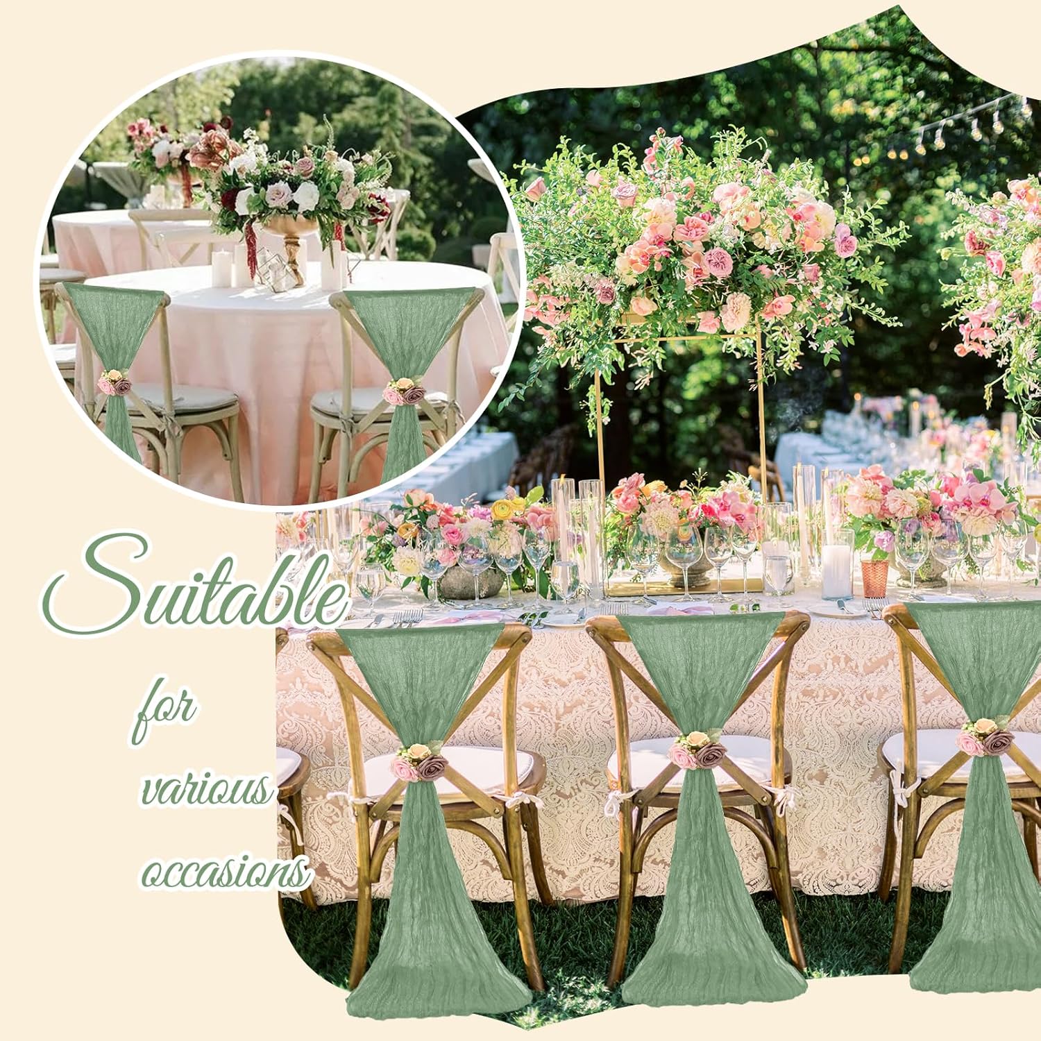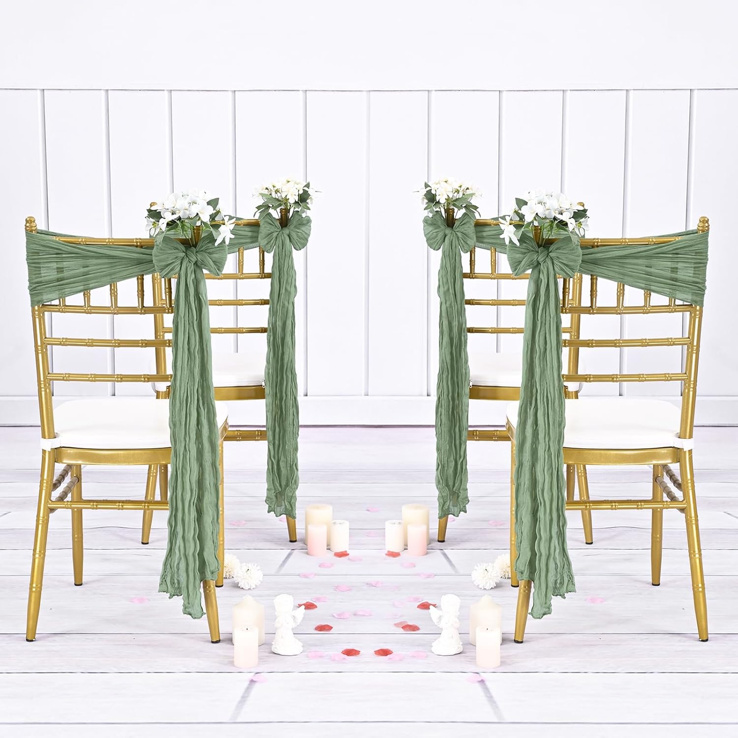 - 【Wide Application】Cheesecloth chair sashes have a romantic and elegant boho style, suitable for wedding, birthday parties, family gathering, baby showers, banquets, Christmas, Thanksgiving Day and other special occasions.It is also a necessary decorative item for restaurants, auditoriums, activity centers, hotels, and other places.