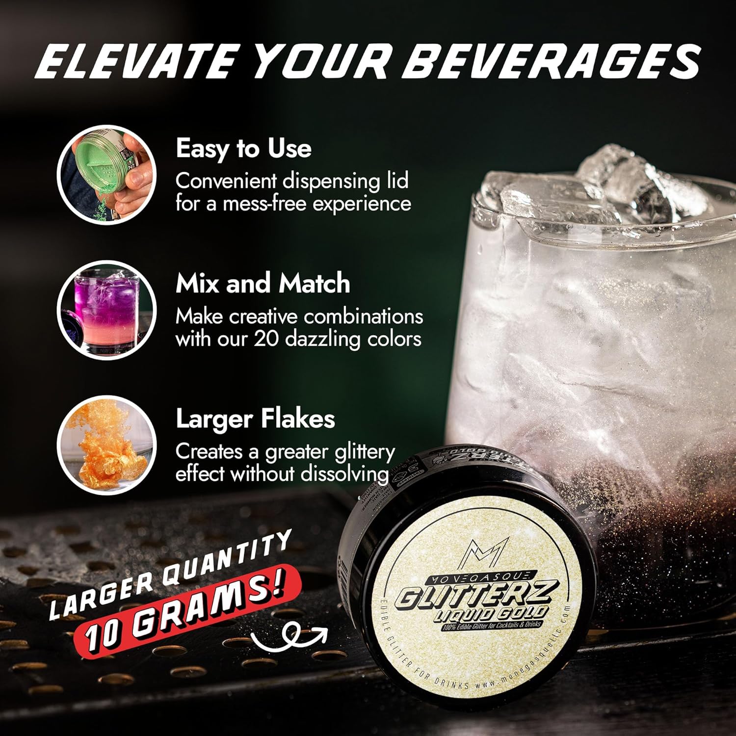 - PREMIUM EDIBLE GLITTER FOR COCKTAILS – Add a touch of glamour to your creations with MONÉGASQUE Glitterz. Perfect for cocktails, cakes, and more, our halloween glitter is flavorless and safe, crafted from mica-based pearlescent and food-grade colorants.