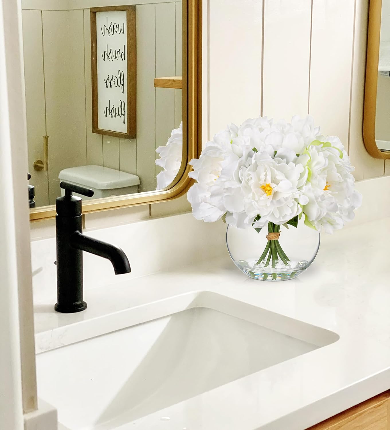 Fake Flowers in Vase White Peonies Artificial Flowers Real Touch Faux Flowers Large Peony Silk Flower Arrangements with Glass Vase with Faux Water for Home Decor Office Table Centerpiece Decorations