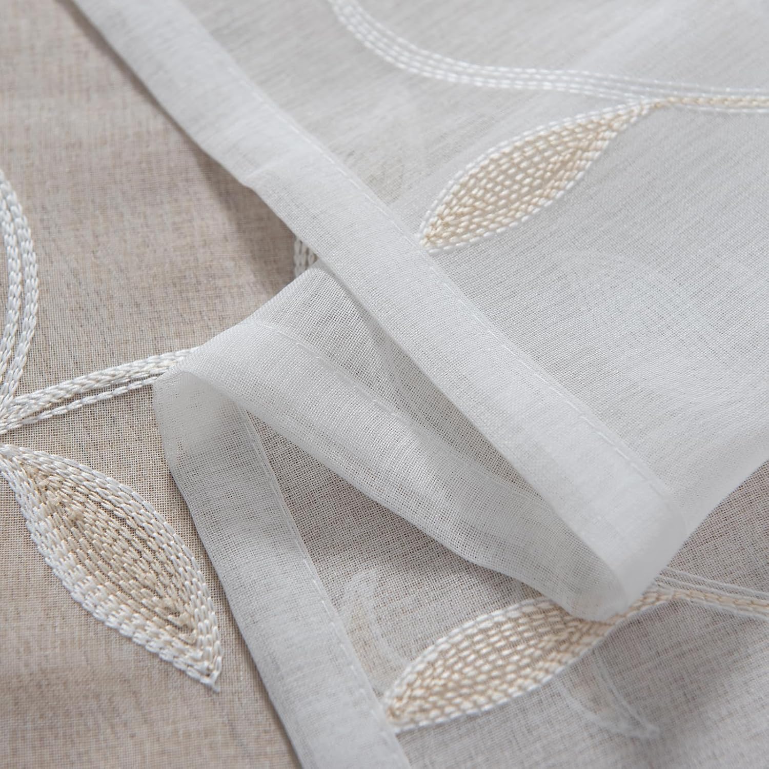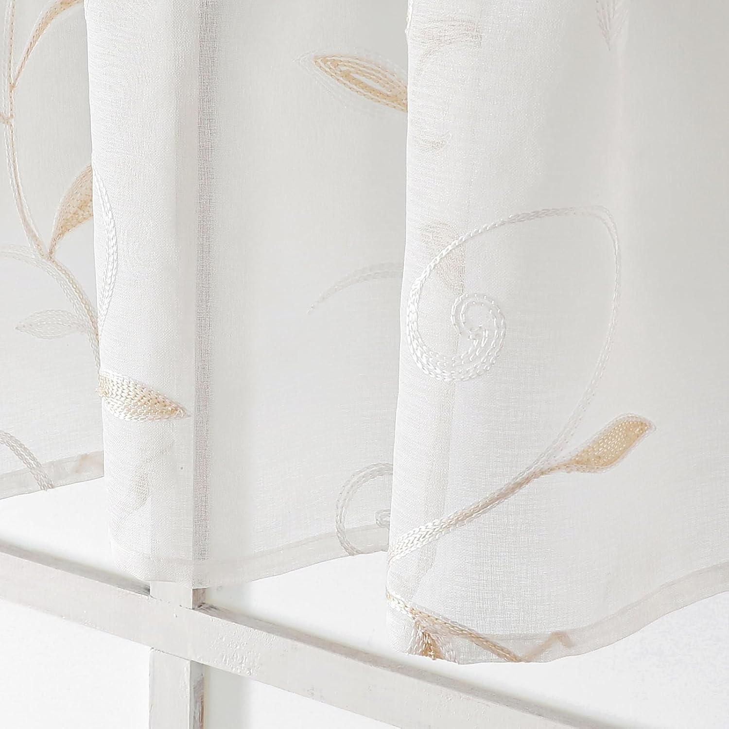 VISIONTEX White Sheer Voile Curtains, Decorative Leaves Embroidery Faux Linen Rod Pocket Window Drapes for Home Kitchen, Living Room and Bedroom 26 x 36 Inch, Set of 2 Curtain Panels