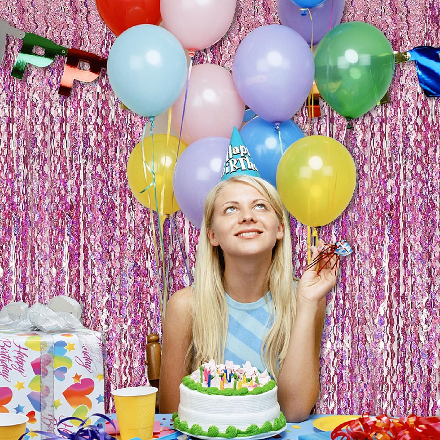 - Reusable Glimmering Fringe Backdrop:Foil party streamer decorations comes with double sided tape on the back of them, peel the tape off then paste the fringe curtain on the top of wall or door, or layer the 2 pack curtains to achieve a thicker and denser effect.Use your own tapes to make the fringe stick sturdy.