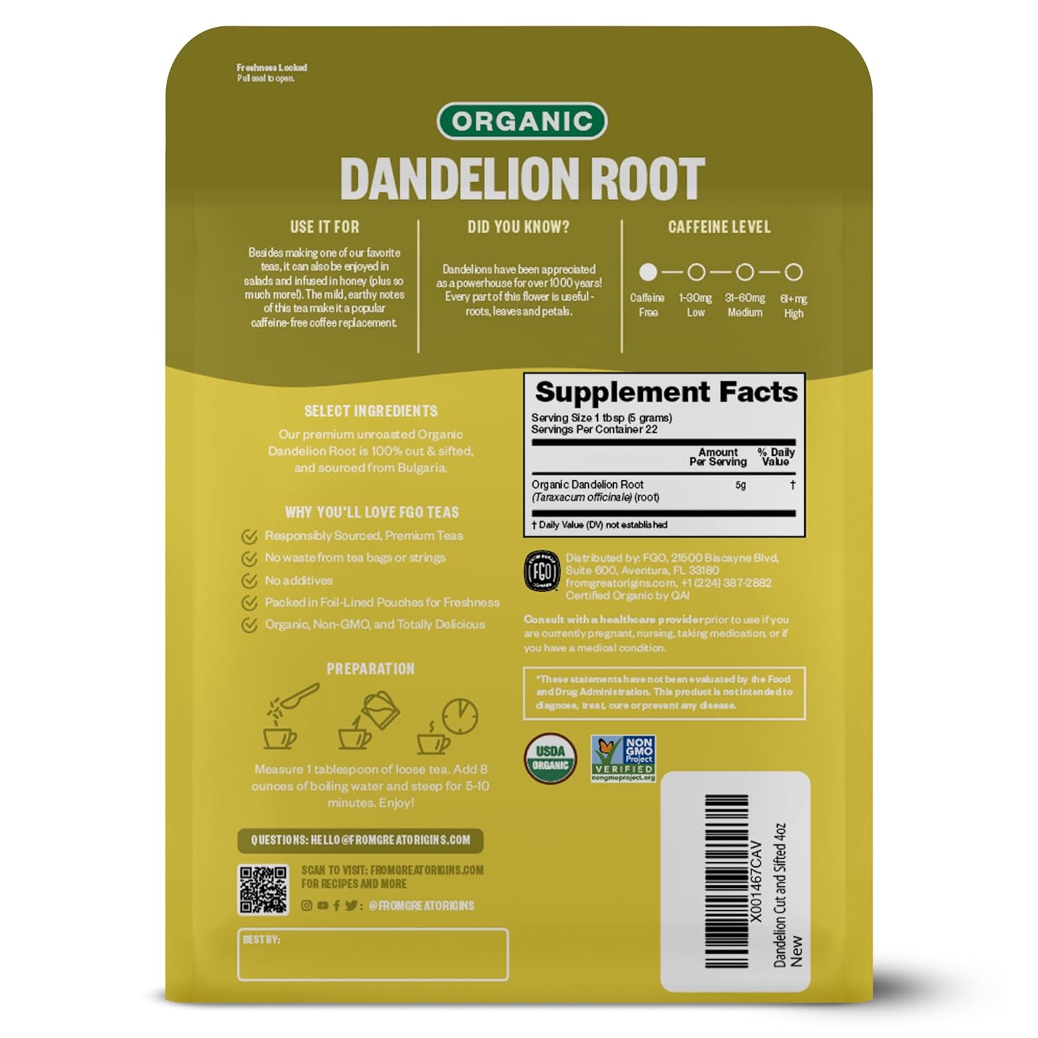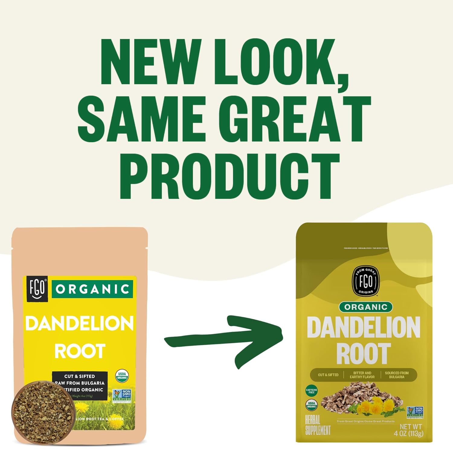 FGO Organic Dandelion Root, Cut and Sifted Loose Tea, 4 Ounce Resealable Bag, Packaging May Vary (Pack of 1)