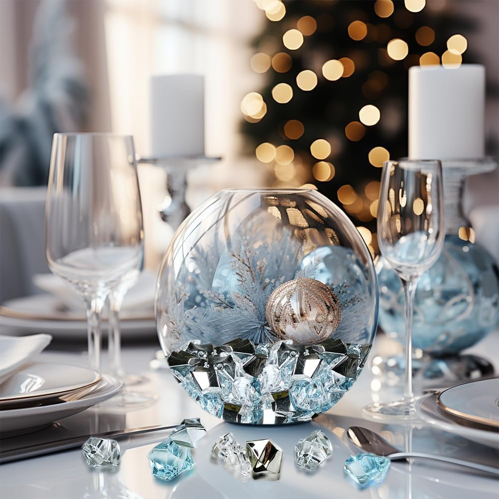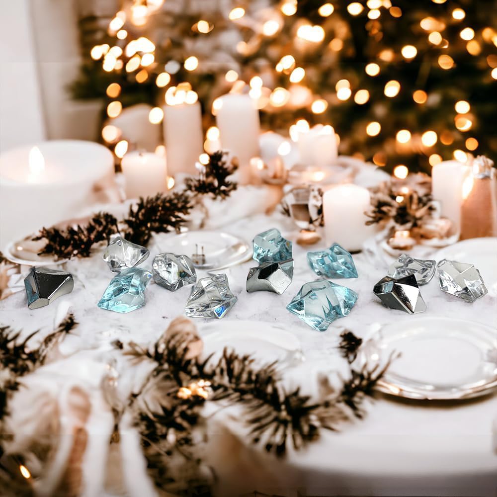 HappyFiller 14 OZ Fake Ice Rocks Cubes Acrylic Gems Stones for Winter Decorations,Christmas Vase Fillers,Wedding Table Scatters,Crafts,Home Centerpieces,Clear,Sea Blue,Silver Mix