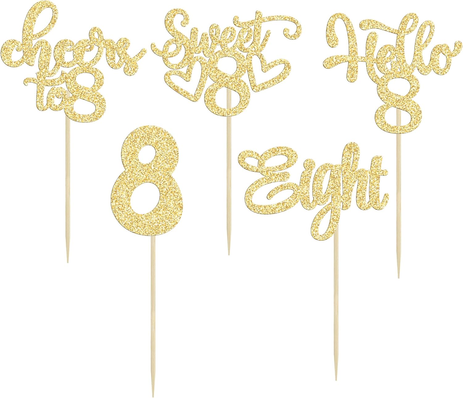 30Pcs 8th Birthday Cupcake Toppers Glitter Eight Hello 8 Cupcake Picks Cheers to 8 Years Old Cake Decorations for 8th Birthday Party Supplies Gold