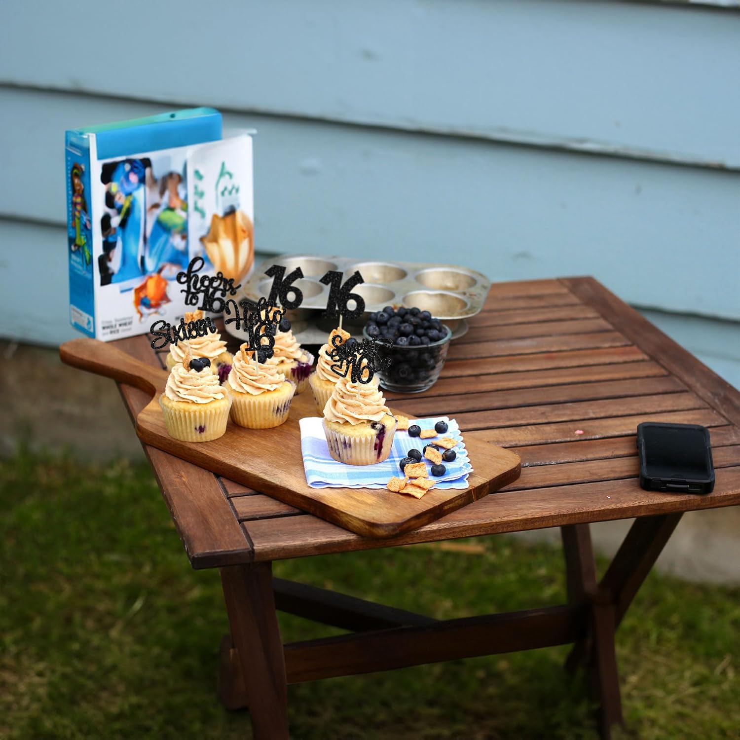 30pcs 16th Birthday Cupcake Toppers - Sixteen Happy Cupcake Picks, Cheers to 16 Sweet 16 Cake Decorations for 16th Birthday Party Supplies - Black Glitter