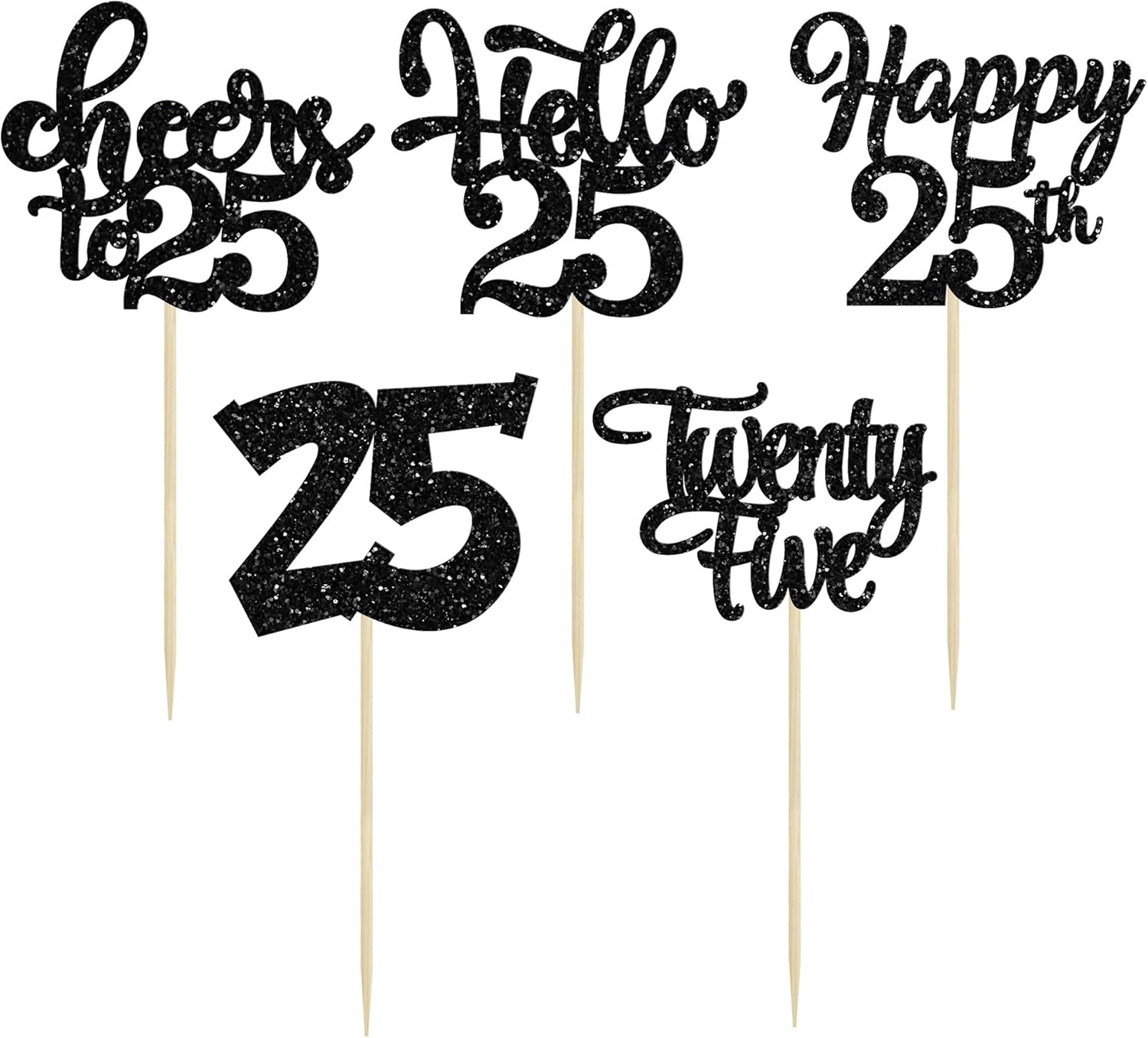 30pcs 25th Birthday Cupcake Toppers - 25th Anniversary Cake Decorations with Black Glitter