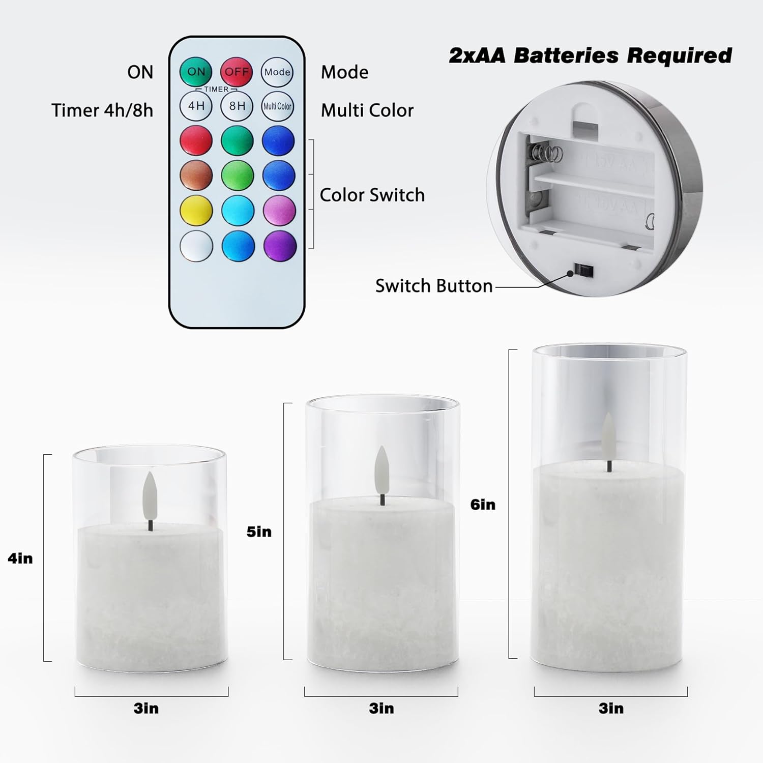 12Colors Ice Crystal Real Wax Glass Flameless Candles with Remote & Timer, Battery Operated Candles with Warm Flickering Flame, Realistic LED Candle for Wedding Home Decor [D3×H4/5"/6"] 3Pack