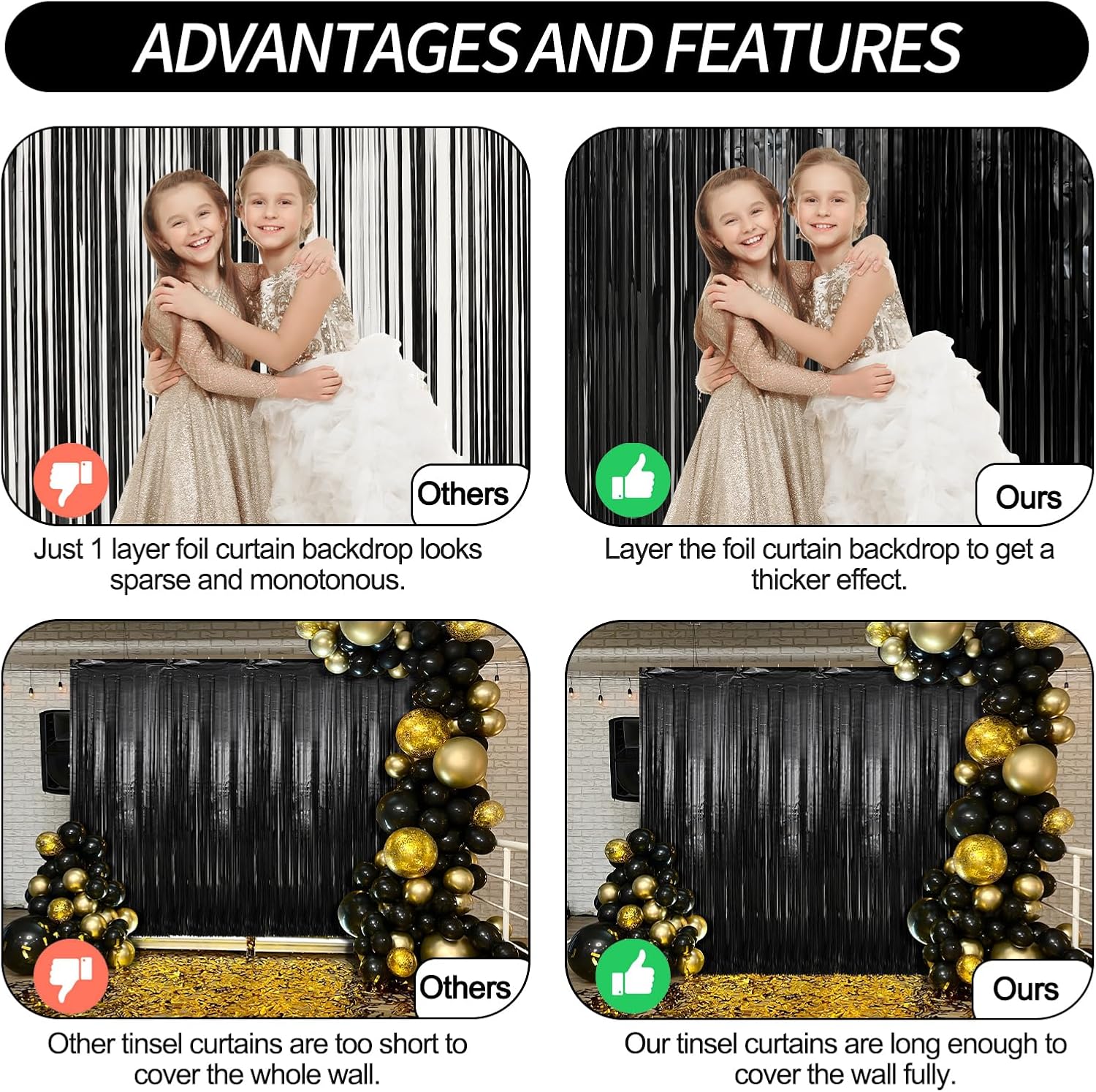 - Durable & Reusable - These party backdrop are made of durable tinsel with a shiny surface, which will keep the shimmer effect all the time, so they can be reused at another time, and light up your parties every time.