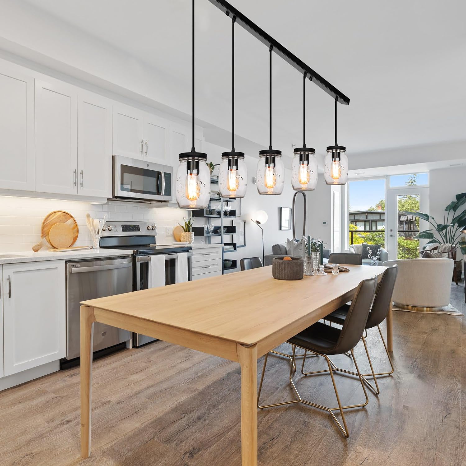 Glass Mason Jar Light Fixtures, 5-Light Adjustable Height Pendant Ceiling Lights Flush Mount - Black Country Farmhouse Lights for Kitchen Dining Room Foyer Stairway Hallway Entryway Porch