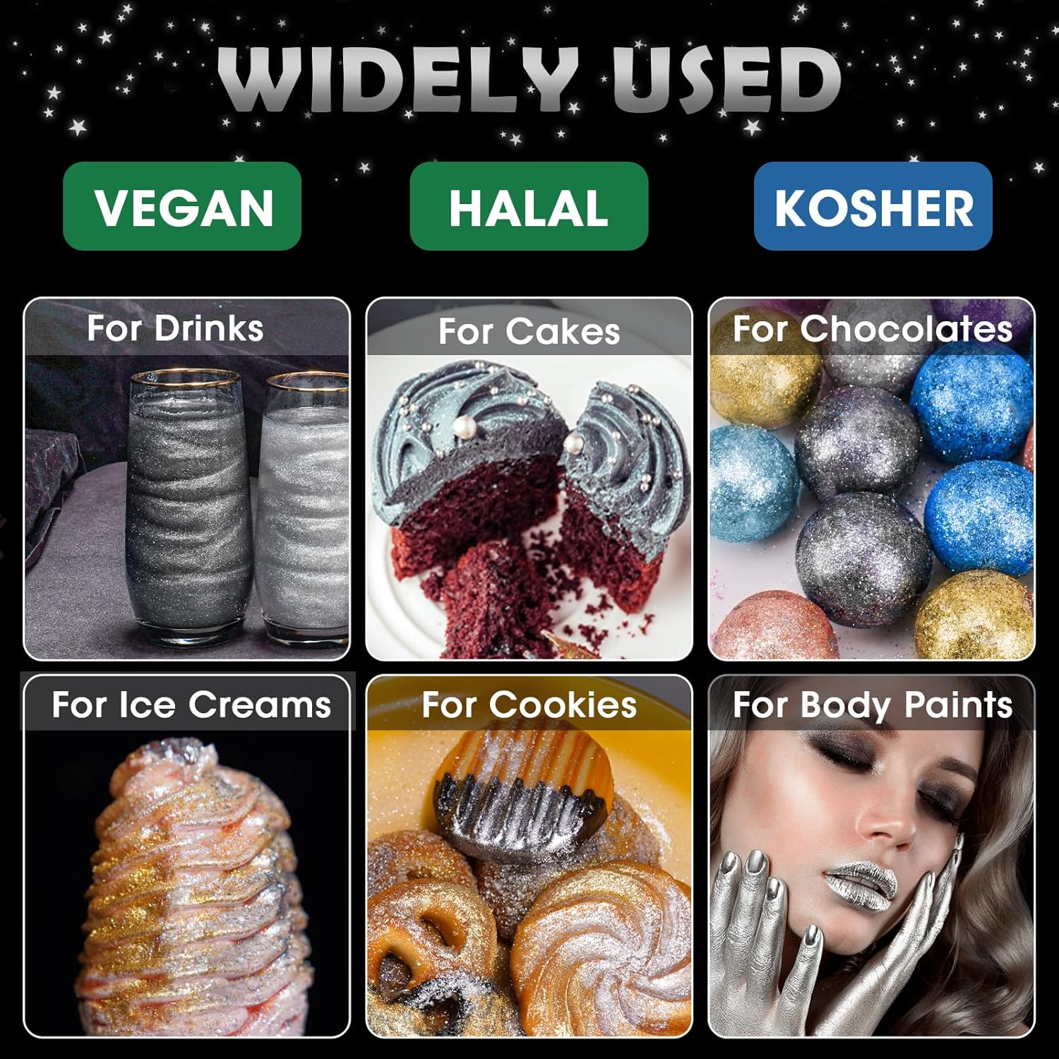 - 🌟【Vegan & Allergen-Free】Food-grade glitter uses only the highest quality vegan ingredients and does not contain common food allergens, including gluten, nuts or dairy products, so everyone can use and enjoy this product regardless of diet or food allergies. Unlike food contact glitter, these are 100% edible, so you don't need to worry about using them in your creations to make them sparkle for all.
