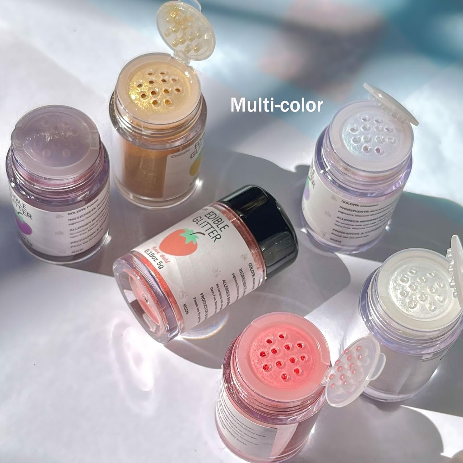 - 11 Edible Glitter Dust Colors Are Available - Includes: Iridescent Prism Powder, Rose gold, Gold, Pink, Clear white, Purple, Silver, Red, Green, Orange, Black. 5 Grams Each Jar. It is an ideal choice set for Halloween, Christmas, Wedding, and more holidays to decor.