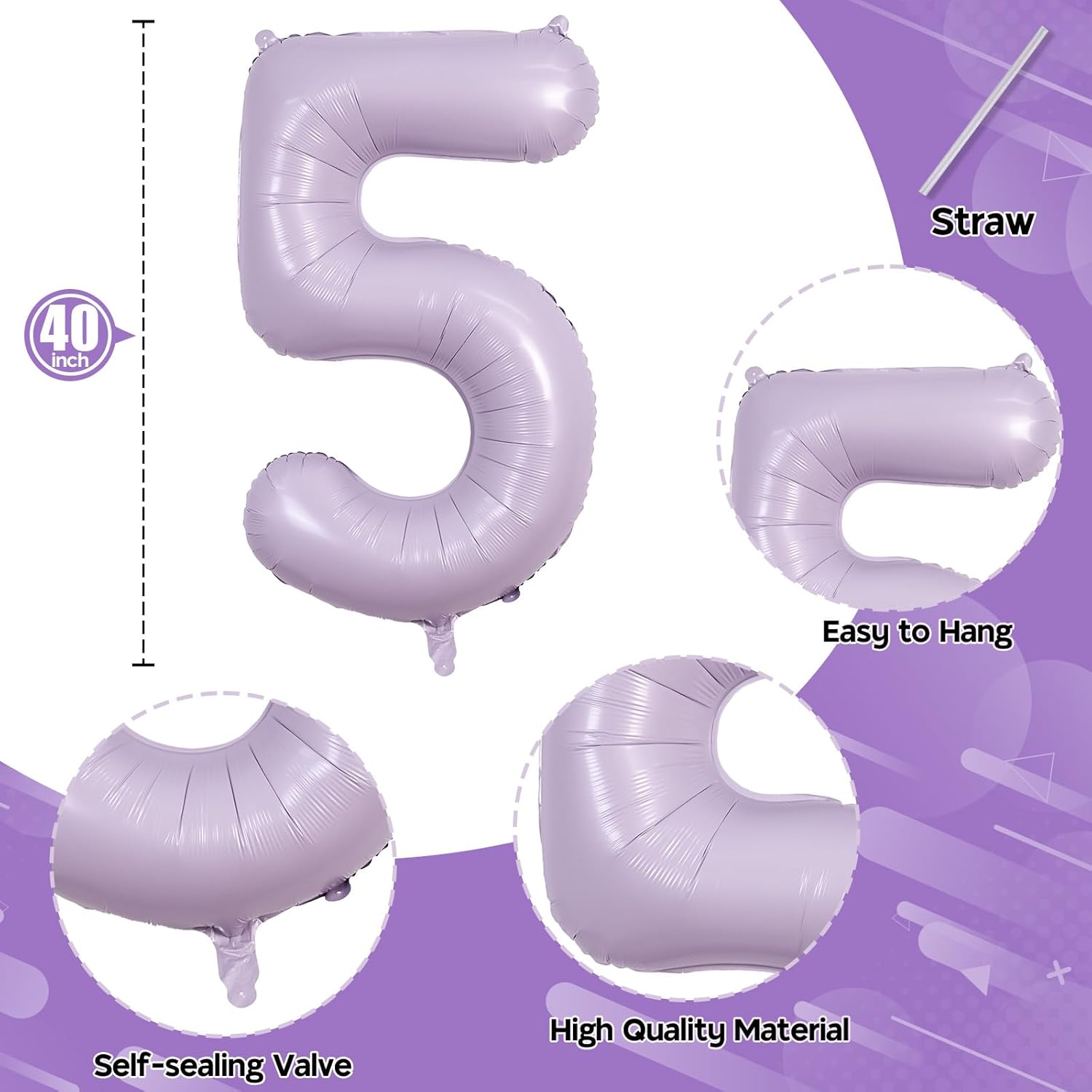 - 💕 Pastel Purple Number 5 Balloon 💕 - You will get 1pc 40 inch light purple mylar foil number 5 balloon and 1pc straw. Perfect for 5th 15th 25th 50th birthday or anniversary party decorations supplies.