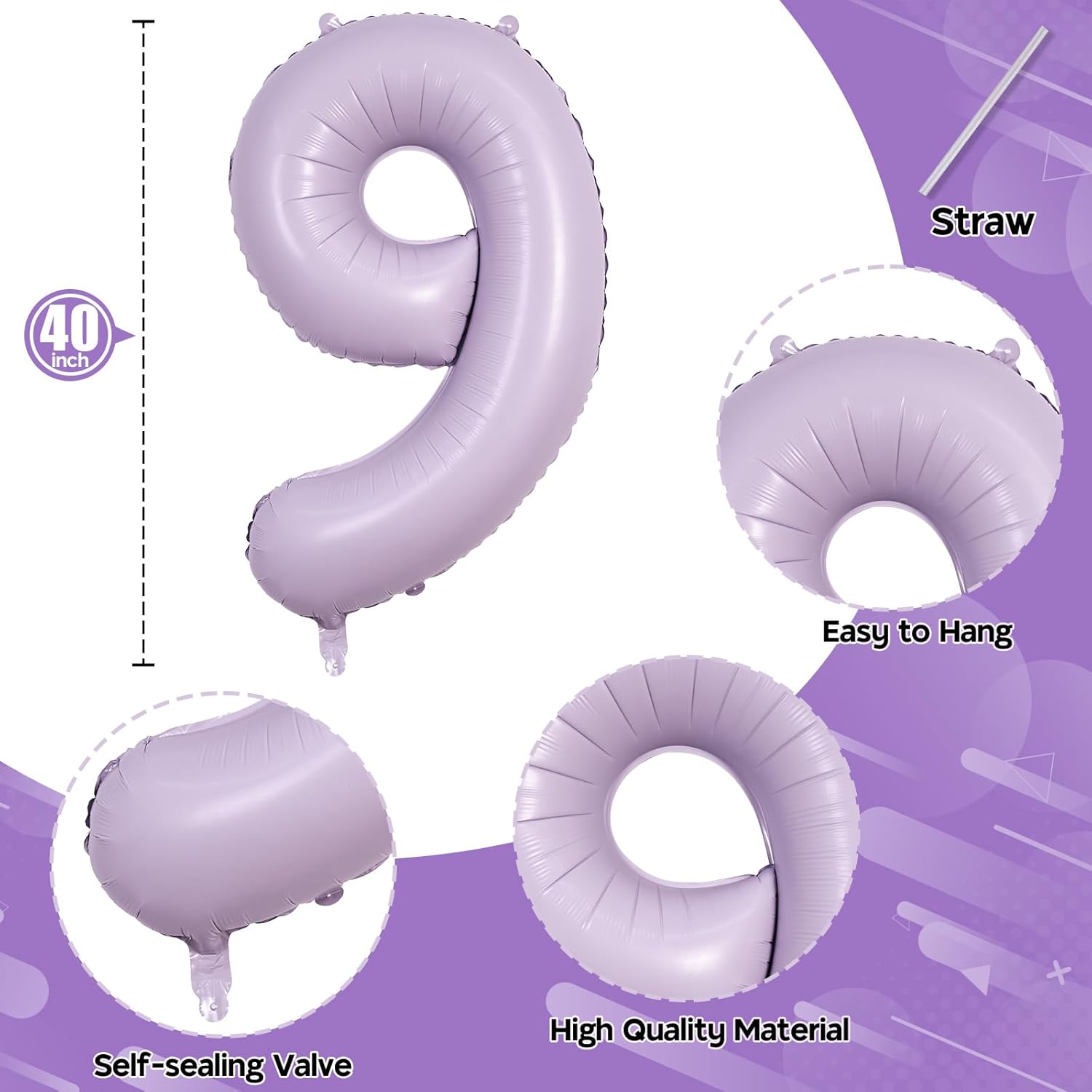 - 💕 Pastel Purple Number 9 Balloon 💕 - You will get 1pc 40 inch light purple mylar foil number 9 balloon and 1pc straw. Perfect for 9th 19th 29th 90th birthday or anniversary party decorations supplies.