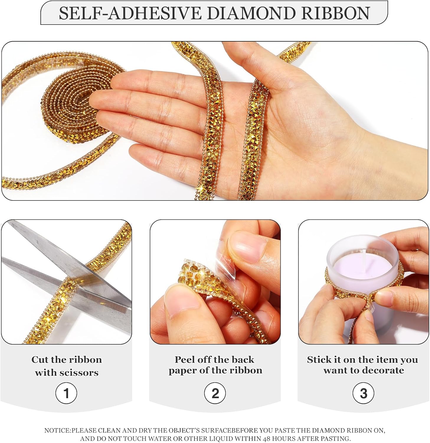 - NOTICE: 1. Please clean and dry the object's surface before you paste the diamond ribbon on, and do not touch water or other liquid within 48 hours after pasting,2. Please open this outside and air them out for a while! because the odor from production is trapped in shipping. Please give it time to let the smell go.