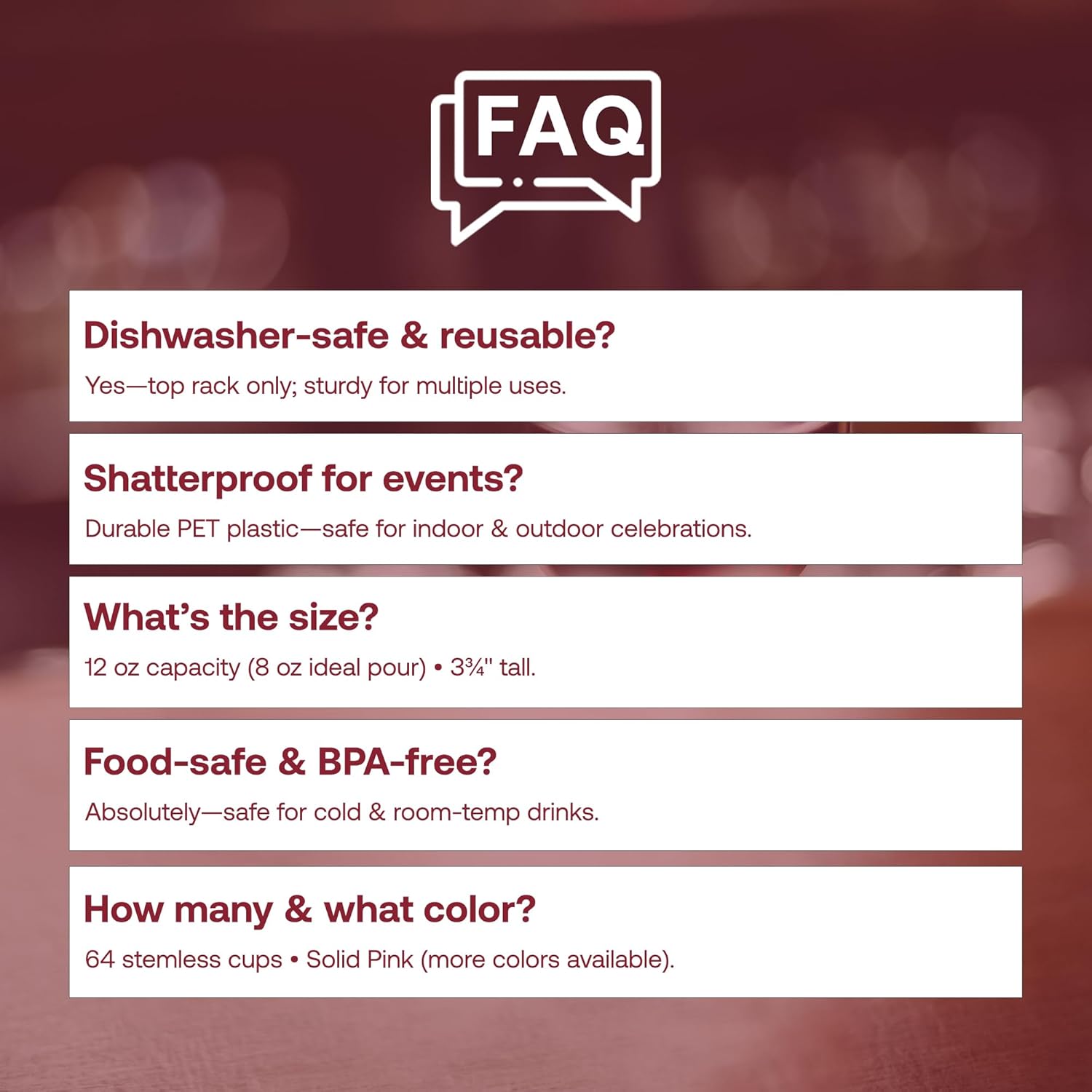 - BULK PACK FOR LARGE CELEBRATIONS – With 64 plastic stemless wine glasses, this bulk set ensures you have enough elegant drinkware for large gatherings, giving every guest a stylish glass.