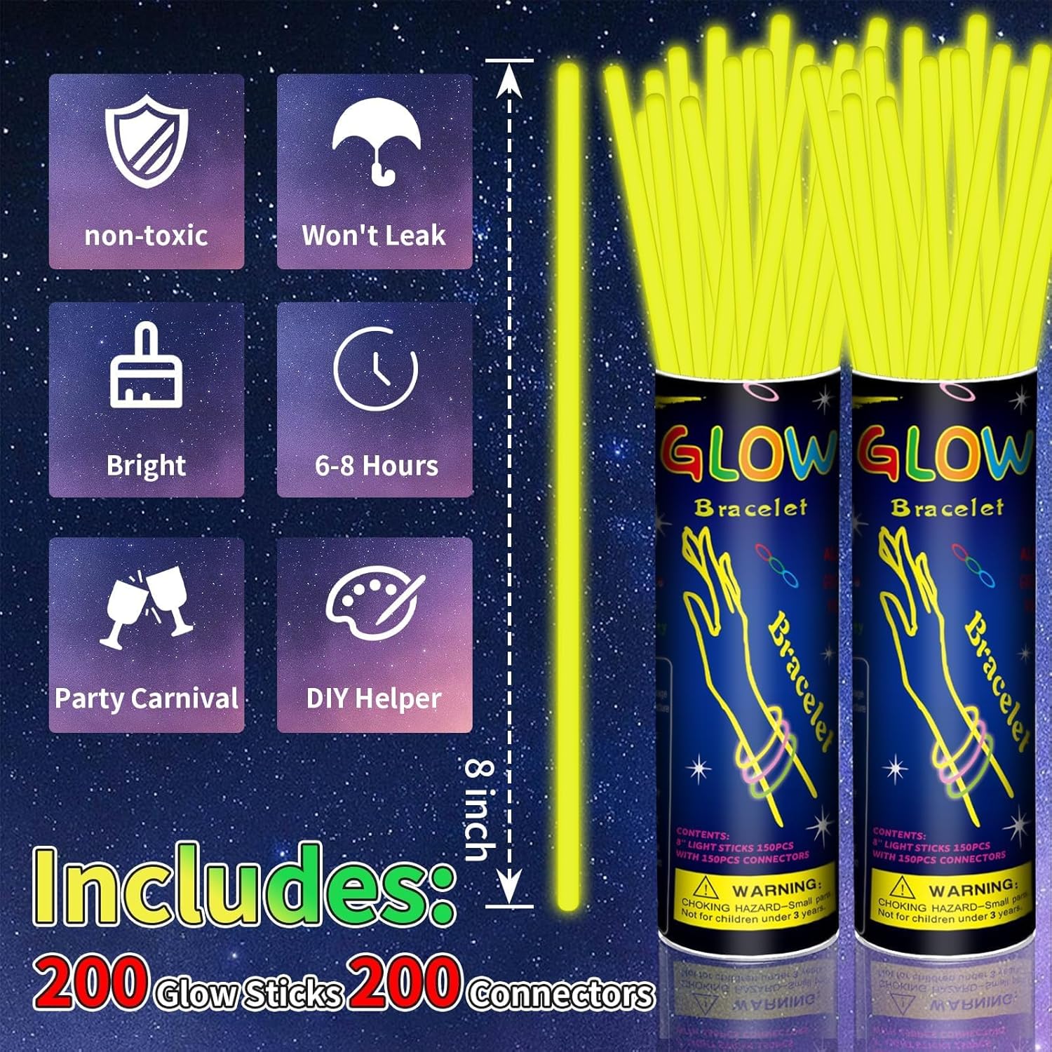 - 200 Pcs Glow Sticks:Our package contains 200 glow sticks and 200 connectors, making it easy to make glow stick bracelet. Make glowing bracelets with your friends!