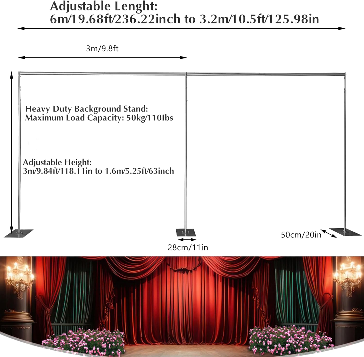 - Functional: Adjustable Telescopic (Lenght: 6m/19.68ft/236.22inch to 3.2m/10.5ft/125.98inch. Height: 3m/9.84ft/118.11in to 1.6m/ 5.25ft / 63inch). Photo studio support equipment photography background wedding party backdrop stand curtain frame stand enough to reuse in various major party event stage background decoration or photo studio photography exhibition.