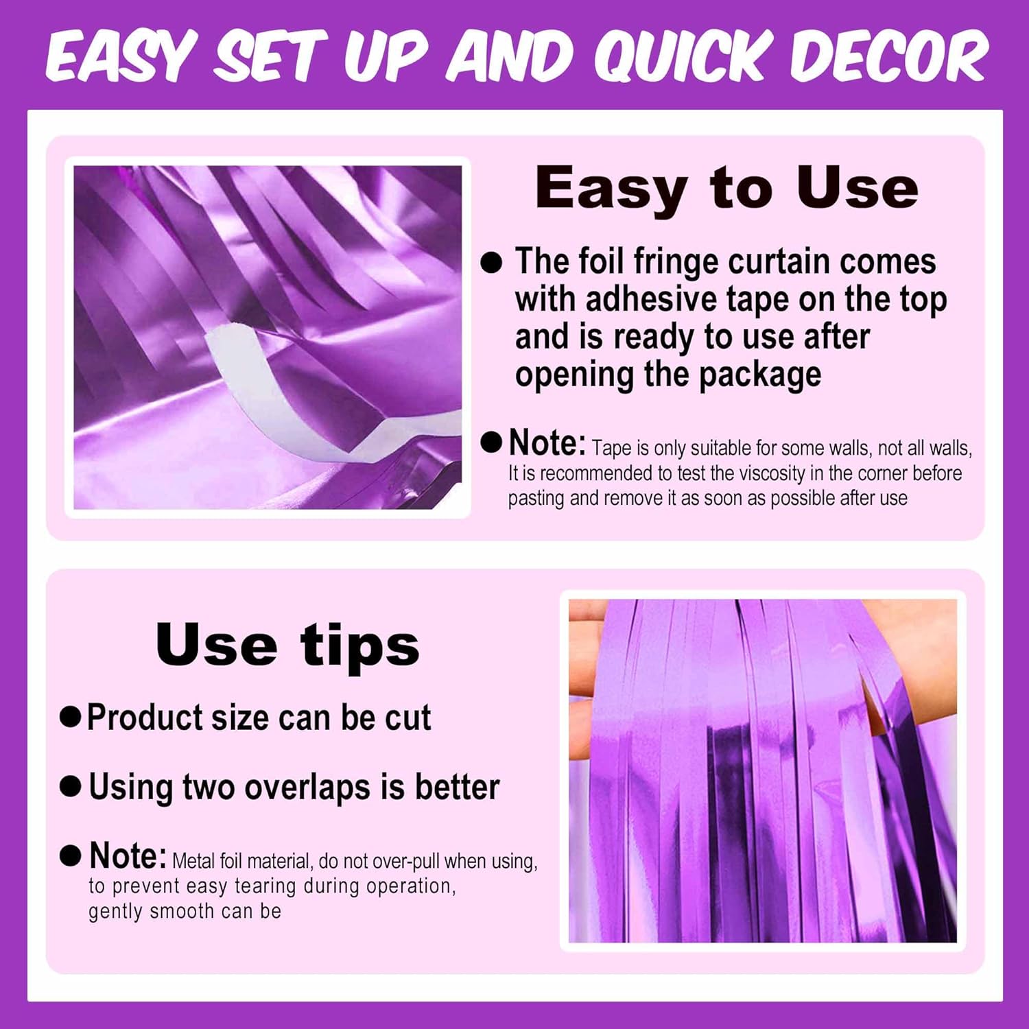 - Easy to Use: The tinsel foil fringe streamers curtain backdrop comes with double sided tape on the top, gently peel plastic strip off and it would be very easy to paste on smooth surfaces such as wall, window, table, door or anywhere you like