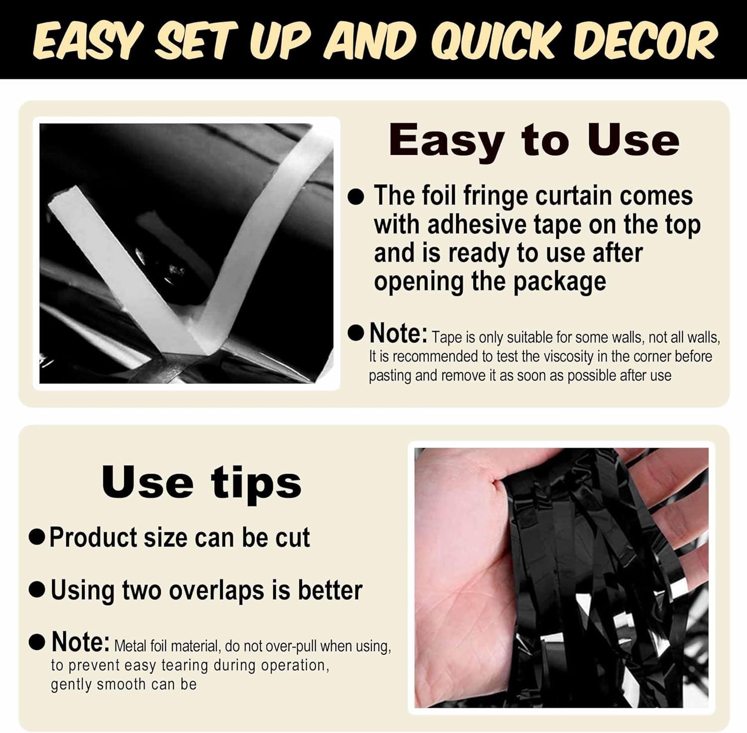 - Easy to Use: The tinsel foil fringe streamers curtain backdrop comes with double sided tape on the top, gently peel plastic strip off and it would be very easy to paste on smooth surfaces such as wall, window, table, door or anywhere you like