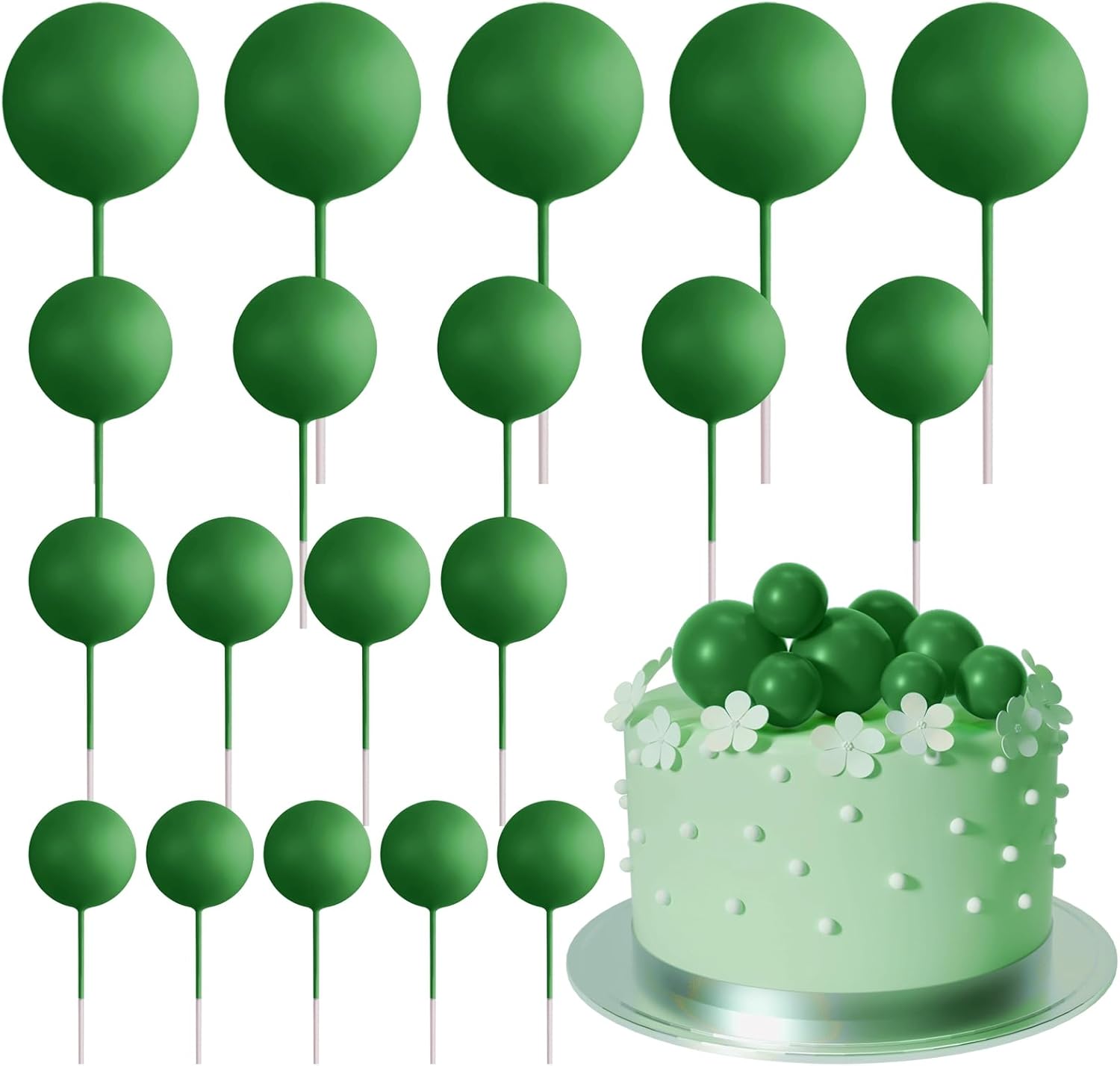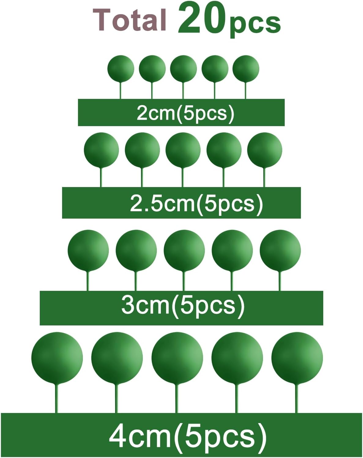 - Package includes: 20 pcs dark green ball cake decorations. The diameter of these ball cake toppers are 0.79 inch/ 2 cm, 0.98 inch/ 2.5 cm, 1.18 inches/ 3 cm, 1.57 inches/ 4 cm, 5 pieces of each size.