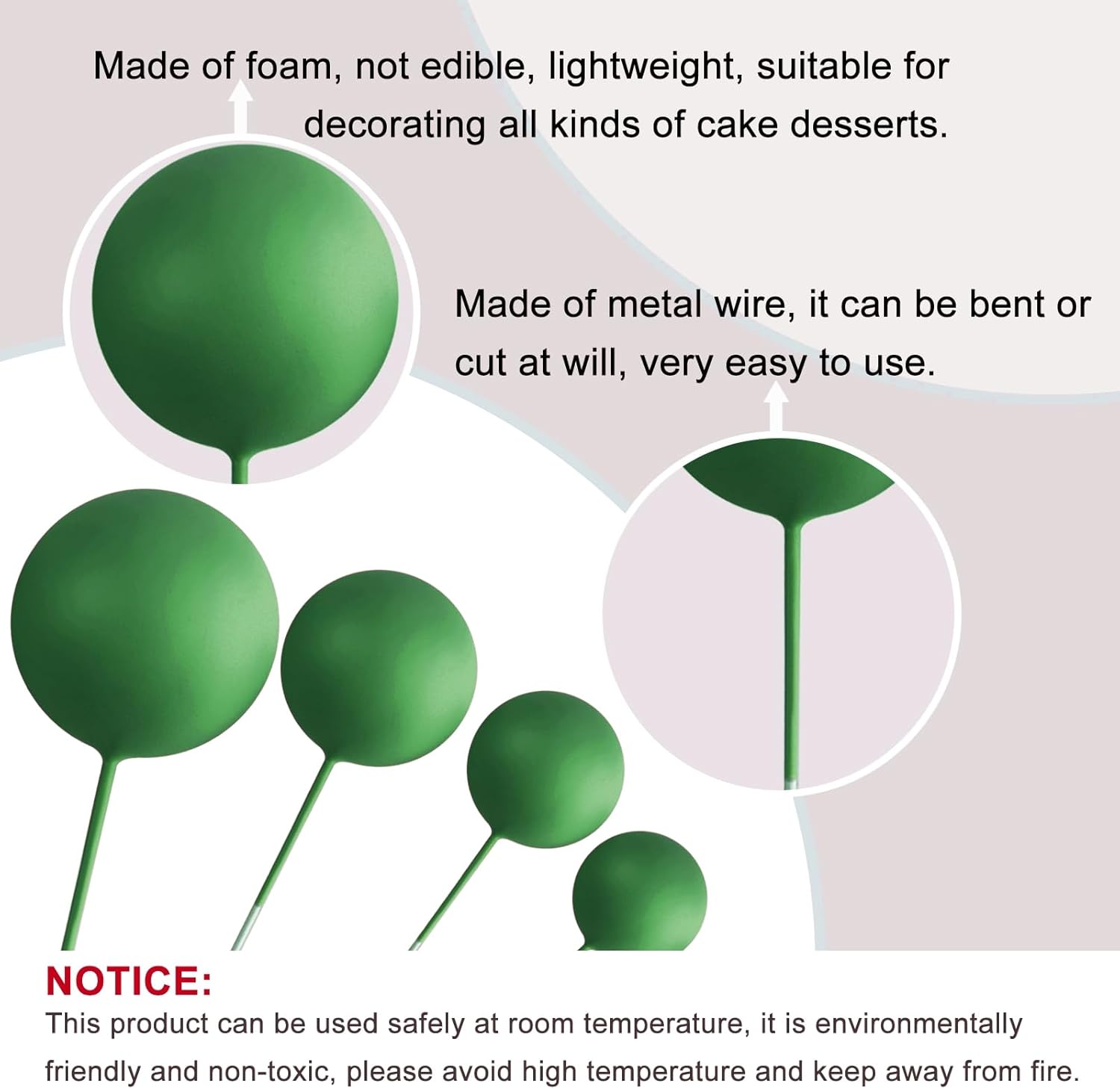- Material: these ball decorations for cake are made of foam and wire. Safe to decorate food at room temperature, such as cake and dessert decorating use, or cupcakes, fruits, cheese and any dish and appetizer you want to decorate.