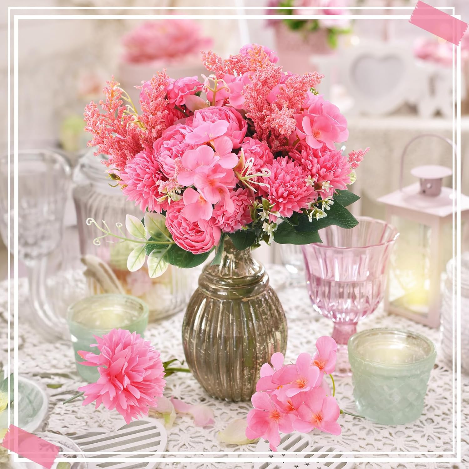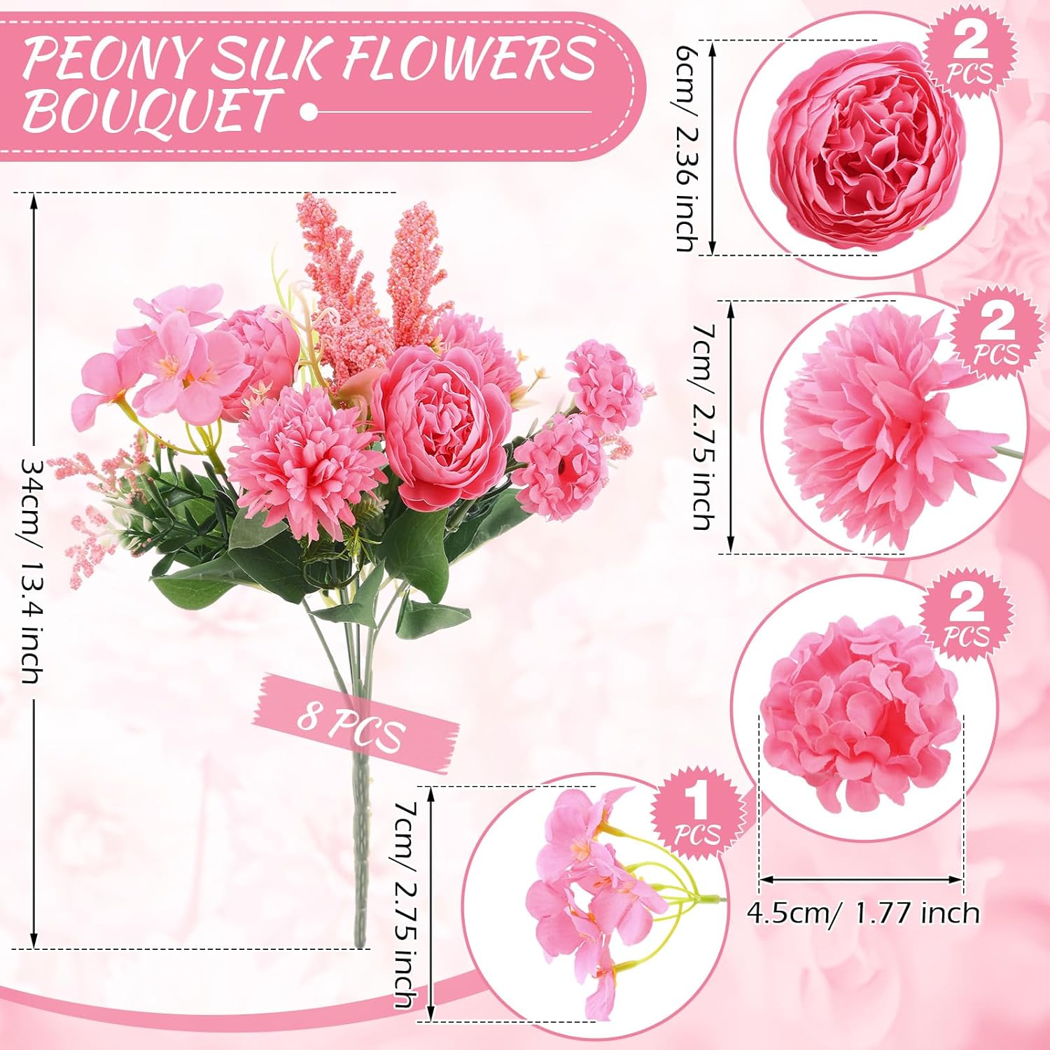 - Vibrant Splashes of Rose Red: this package includes 8 bouquets of rose red silk flowers in 7 heads, offering a stunning array of vibrant rose red shades to your decor; Each bouquet containing 7 prongs of 7 flowers, including 2 large peonies, 2 large ball chrysanthemums, 2 medium ball chrysanthemums, 1 large hydrangea, 3 foam fruit in the middle