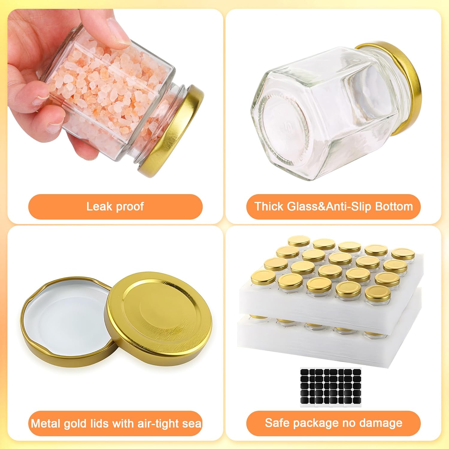 - Safe and Reliable Material: 3oz mini jars with lids are made of premium food grade glass,Lead-free glass,BPA-Free Golden Metal lid.Lids suitable for home canning hot water bath,food grade,bridal shower favors and dishwasher safe,reusable mini jars instead of disposable containers